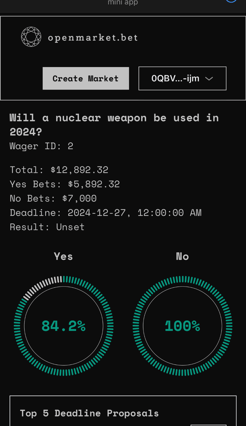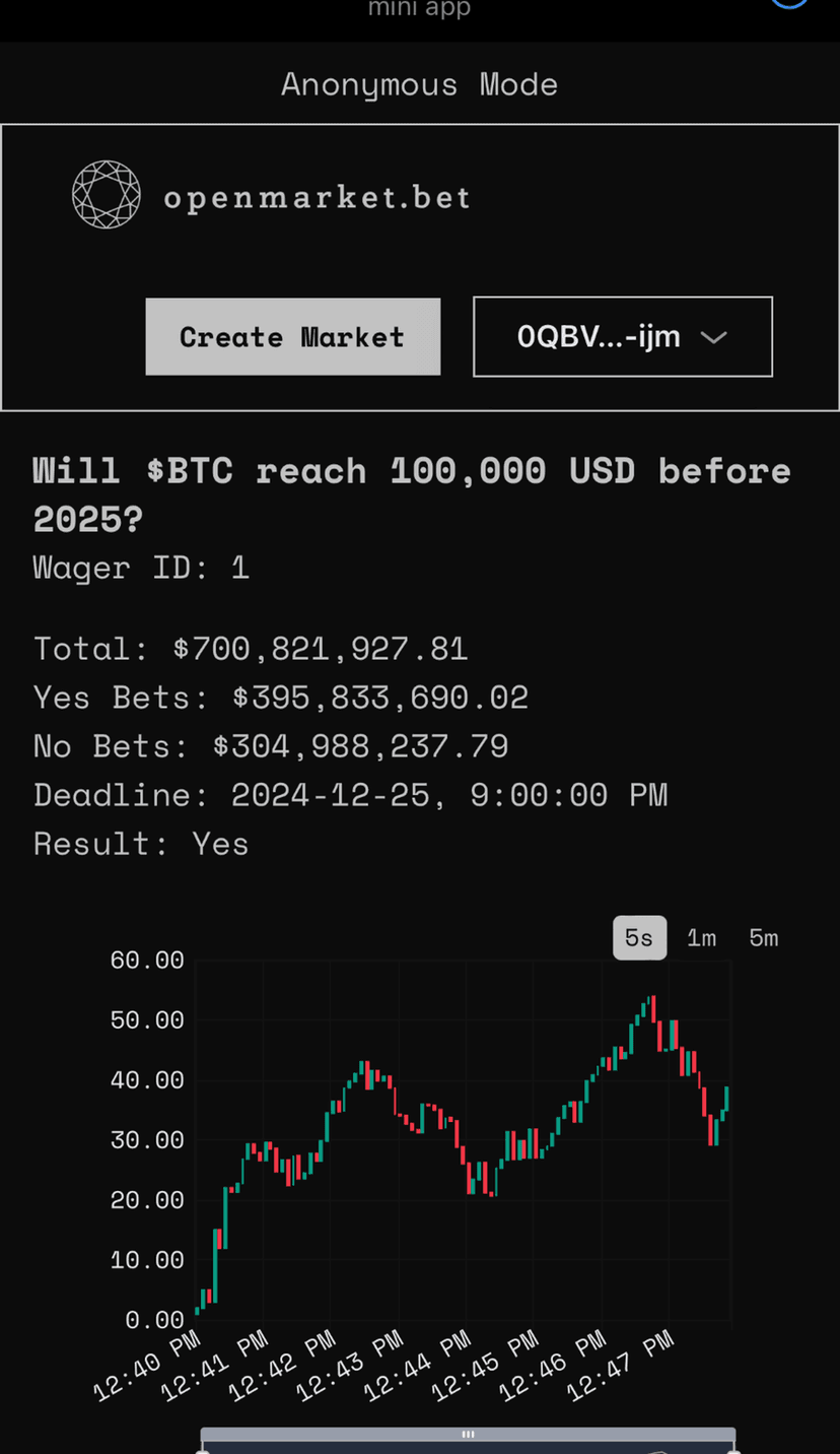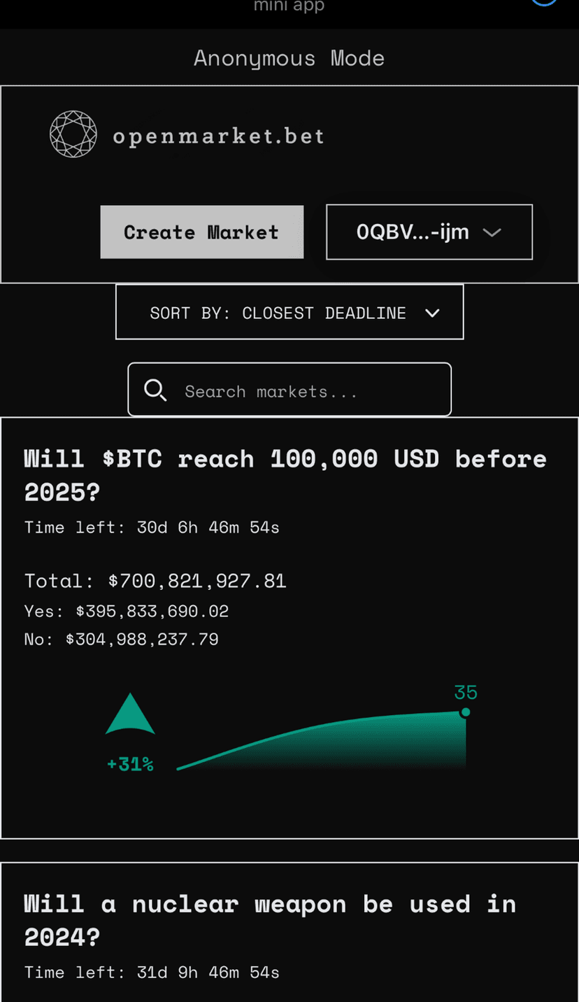 openmarket.bet — децентрализованный рынок предсказаний на блокчейне TON. Пользователи формируют события для прогнозов и принимают ставки других участников в открытом формате, а все расчёты и выплаты выполняются смарт‑контрактами без участия центрального оператора.