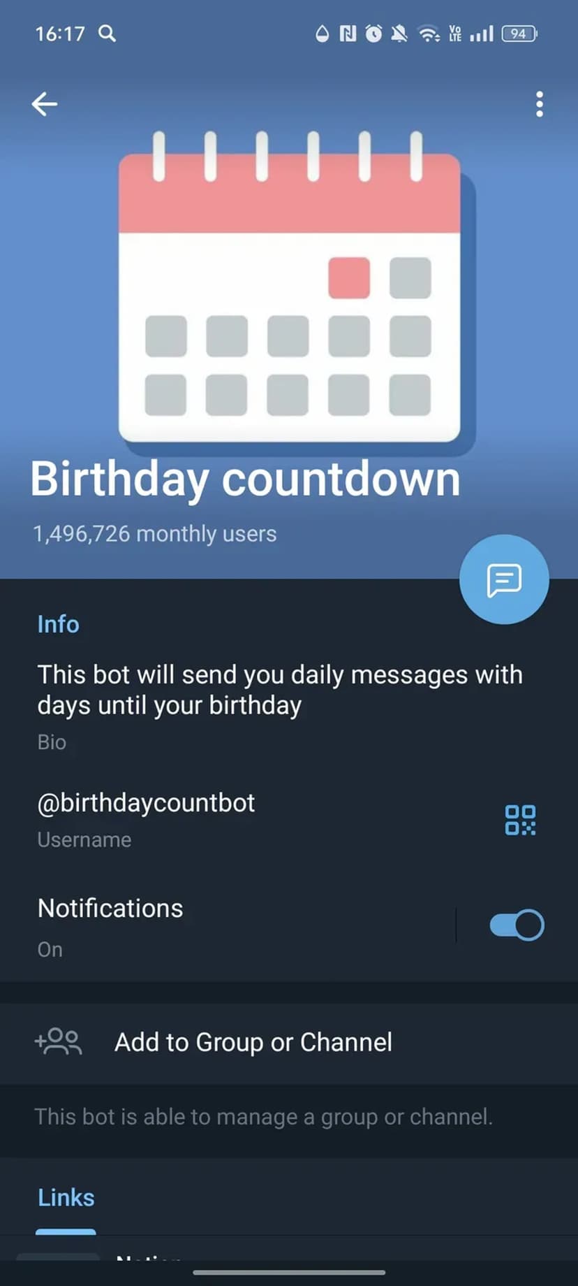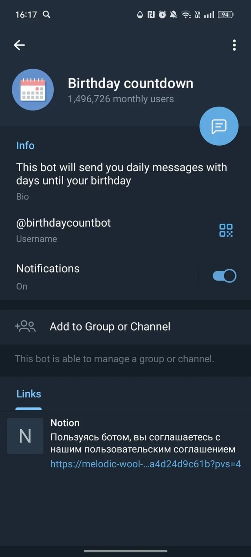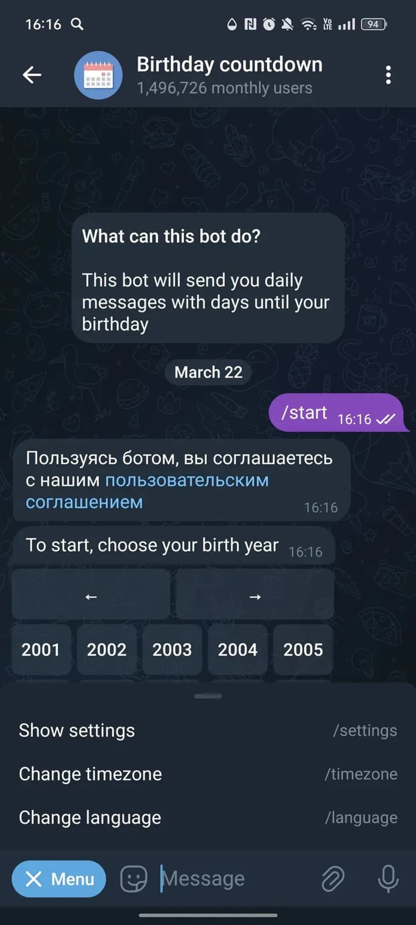 Отсчёт до дня рождения присылает ежедневные сообщения с актуальным числом дней до указанной даты, помогая не пропустить важный день.