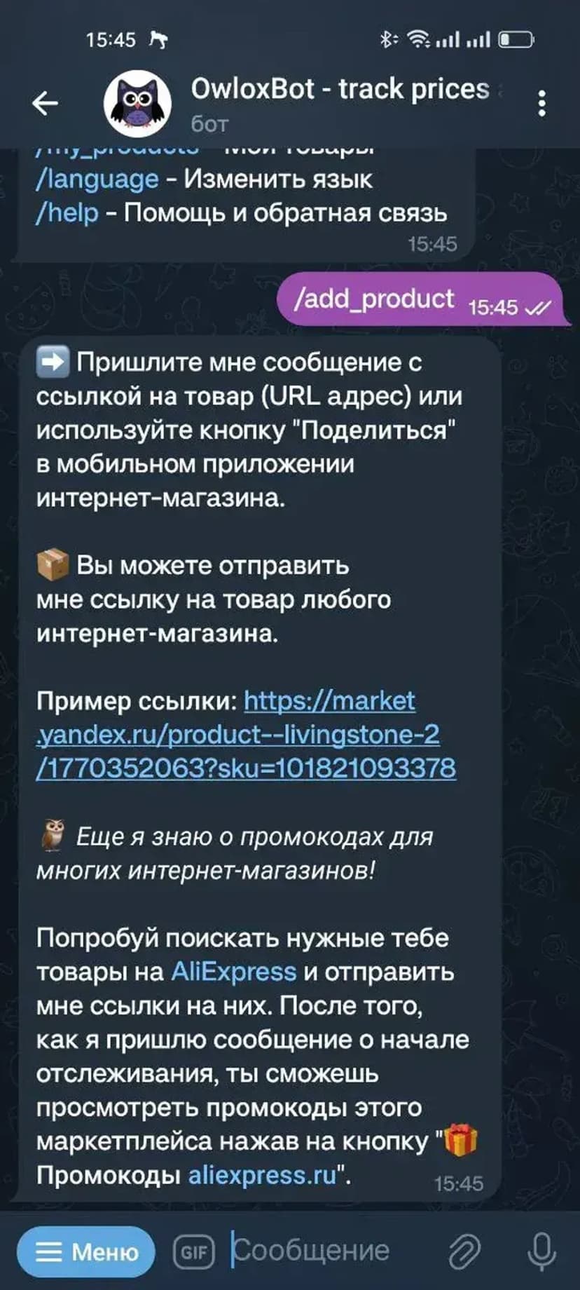 OwloxBot отслеживает цены и наличие товаров в интернет-магазинах и присылает уведомления о выгодных изменениях.