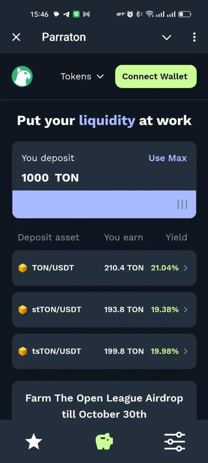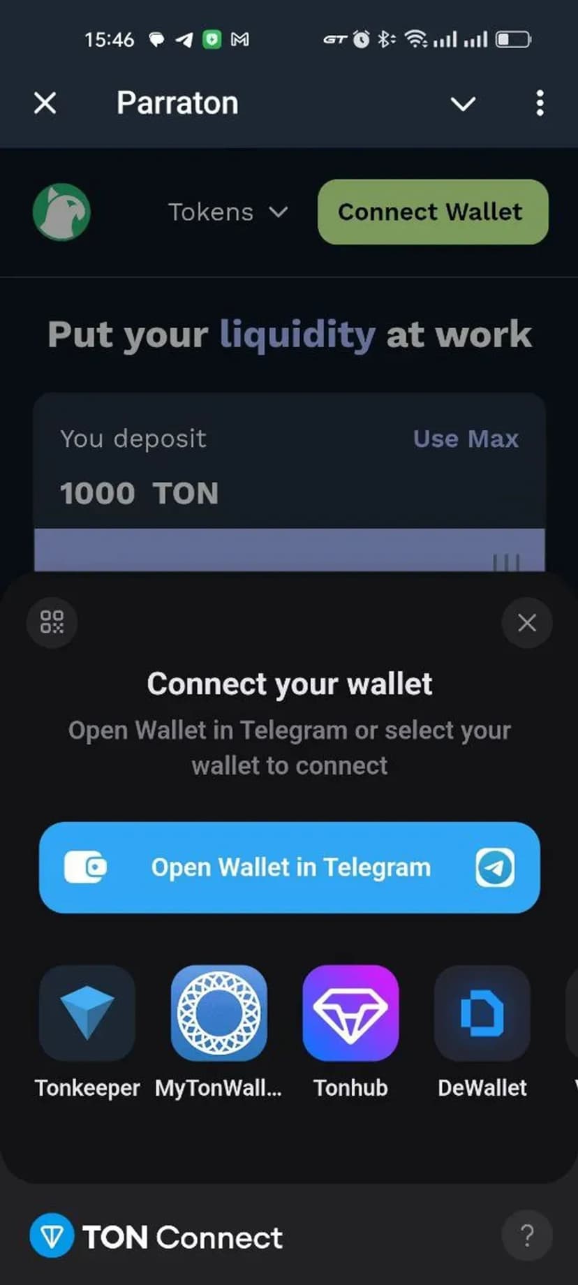 Parraton — мини‑приложение в Telegram для автоматизированной оптимизации доходности в экосистеме TON с использованием эффектов сложного процента. Сервис подключается к протоколам на базе смарт‑контрактов TON и выполняет реинвестирование прибыли без необходимости покидать мессенджер.