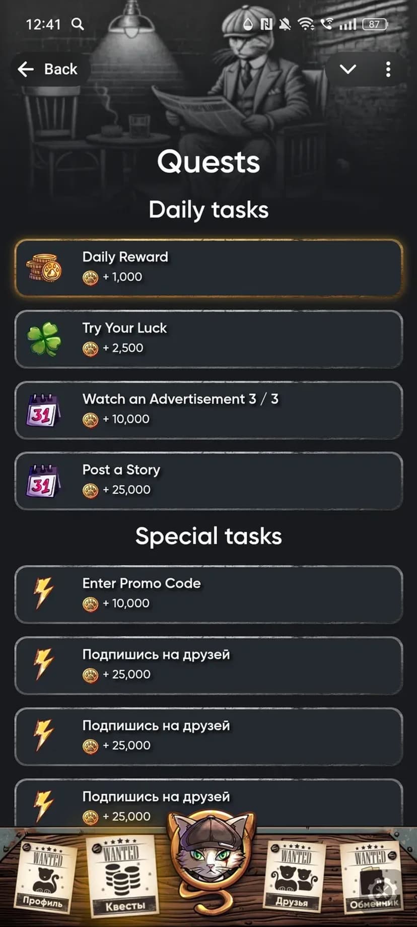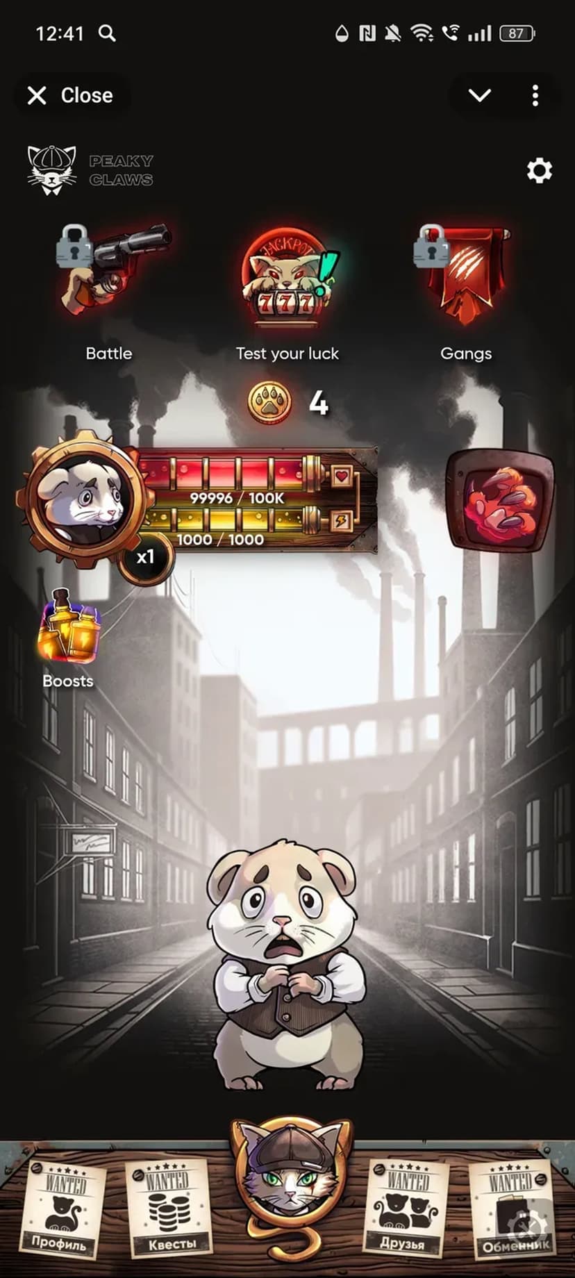 PeakyClaws — динамичная мини-игра внутри Telegram: на главном экране отображаются текущие задания и кнопки для атаки, апгрейда оружия и выбора бустеров. Интерфейс прост и понятен, основные действия вынесены в главное меню для быстрого старта.