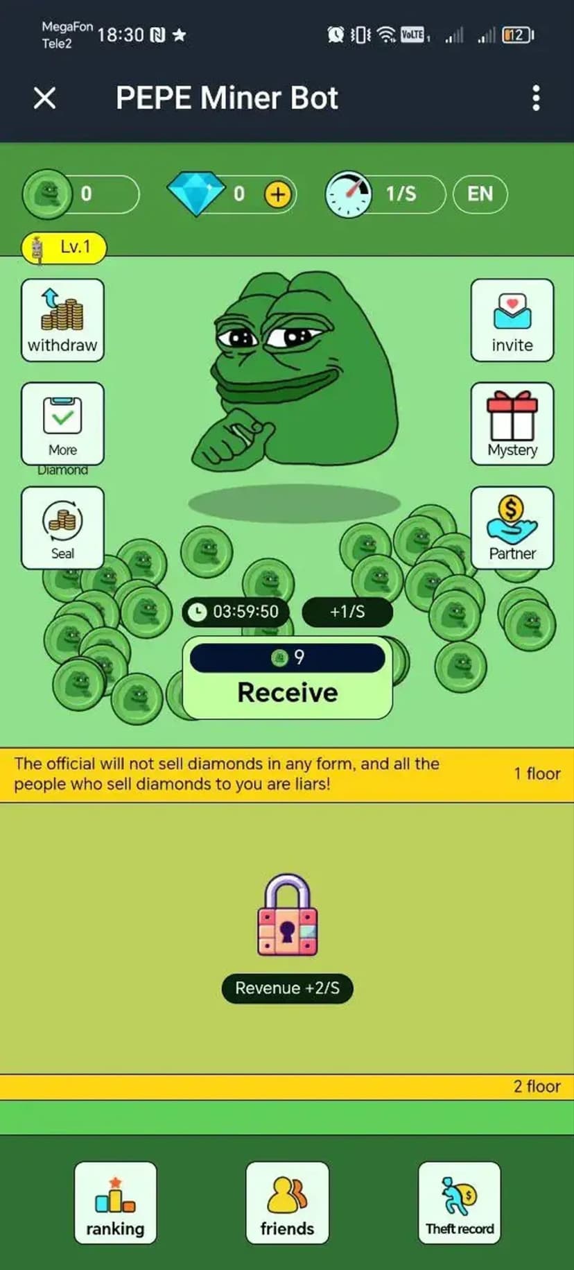 PEPE Miner Bot — майнинг мем-коинов PEPE в реальном времени внутри Telegram. Бот позволяет постепенно накапливать монеты и выводить их на личный криптокошелек.