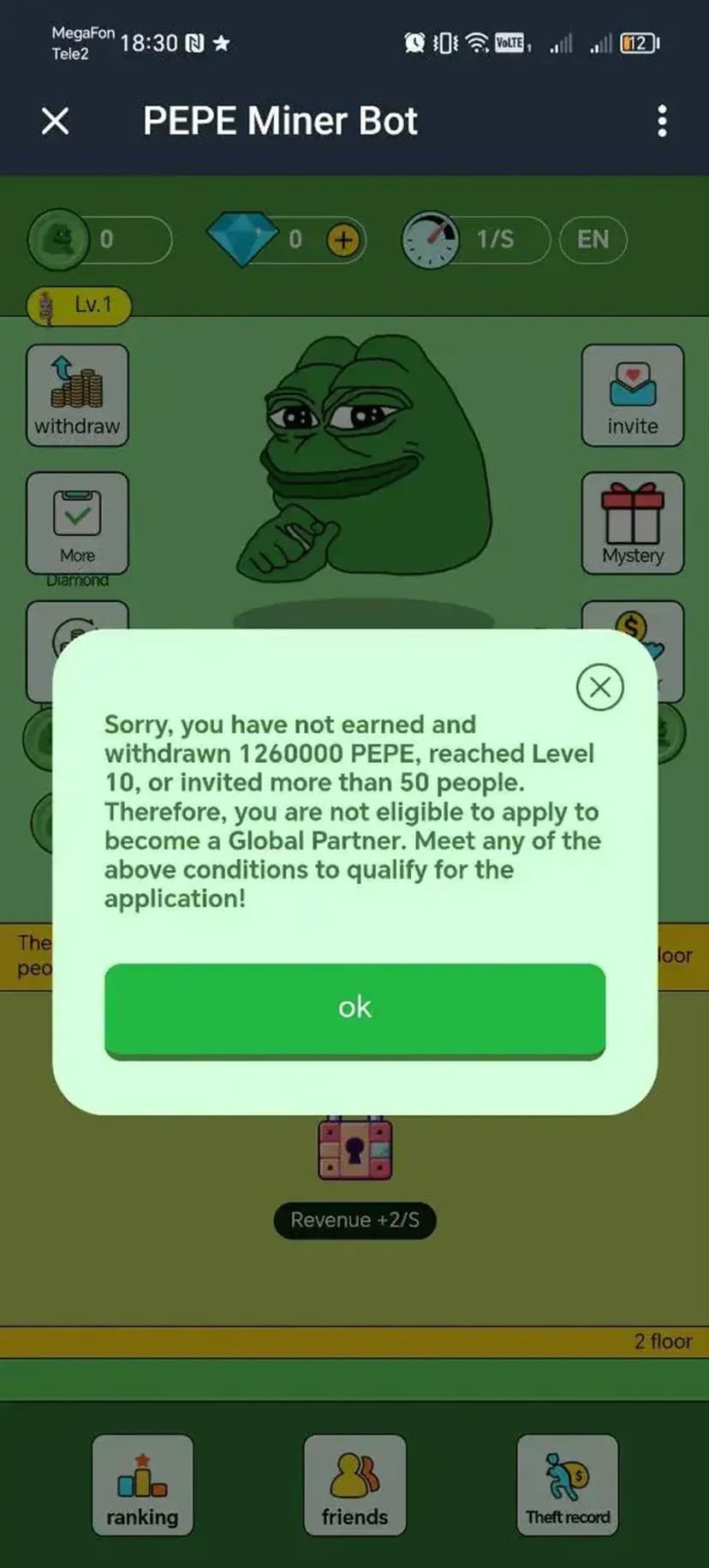 *Нажимая "Открыть в Telegram", вы перейдете к приложению PEPE Miner Bot в мессенджере Telegram