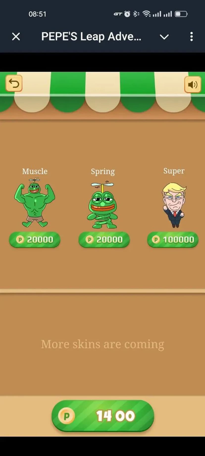 PEPE'S Leap Adventure — динамичная аркада, где вы ведёте персонажа Pepe через серию прыжков, зарабатывая очки и стремясь к лучшему результату среди друзей.