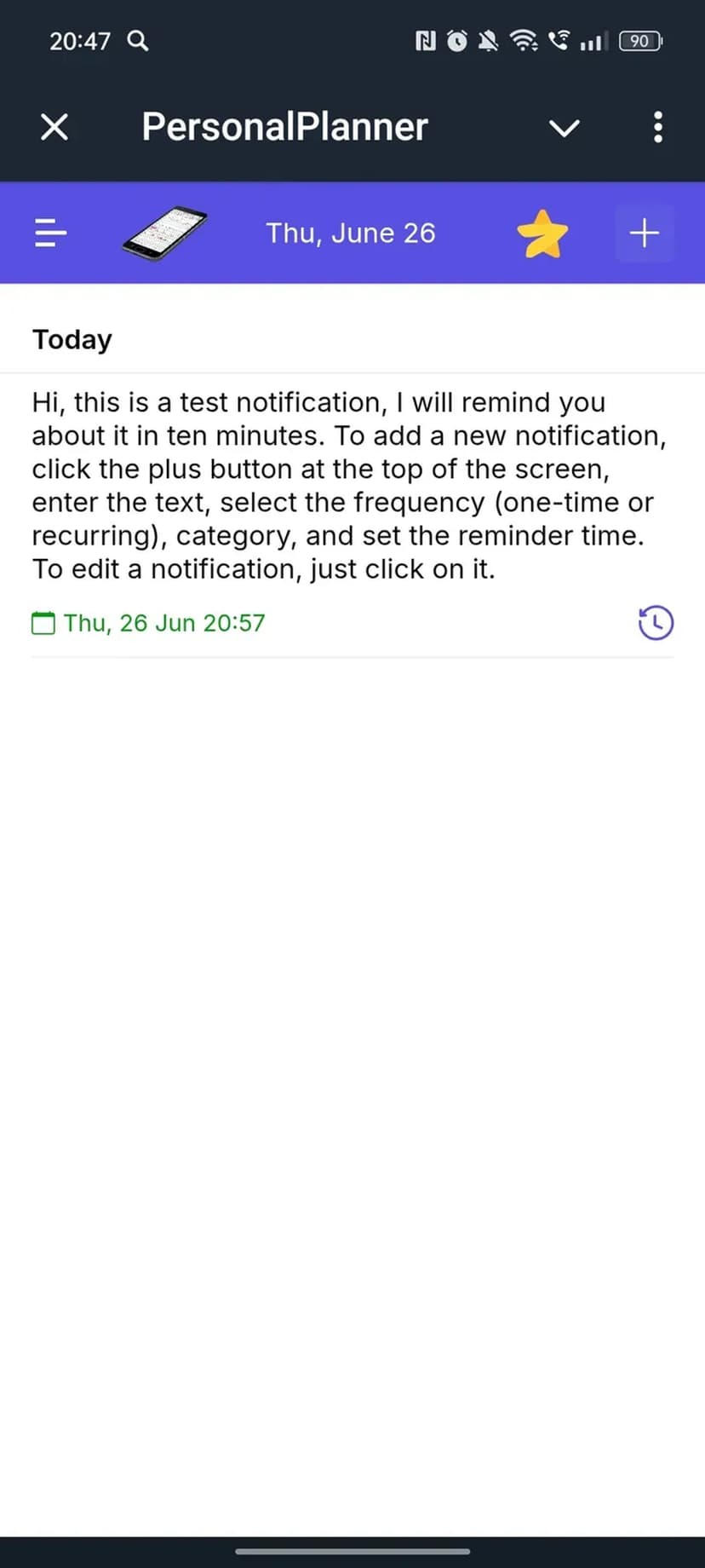 PersonalPlanner помогает планировать личное время и получать напоминания прямо в Telegram. Можно быстро создавать и редактировать задачи и события с указанием даты и времени, а уведомления приходят в чат в назначенный момент.