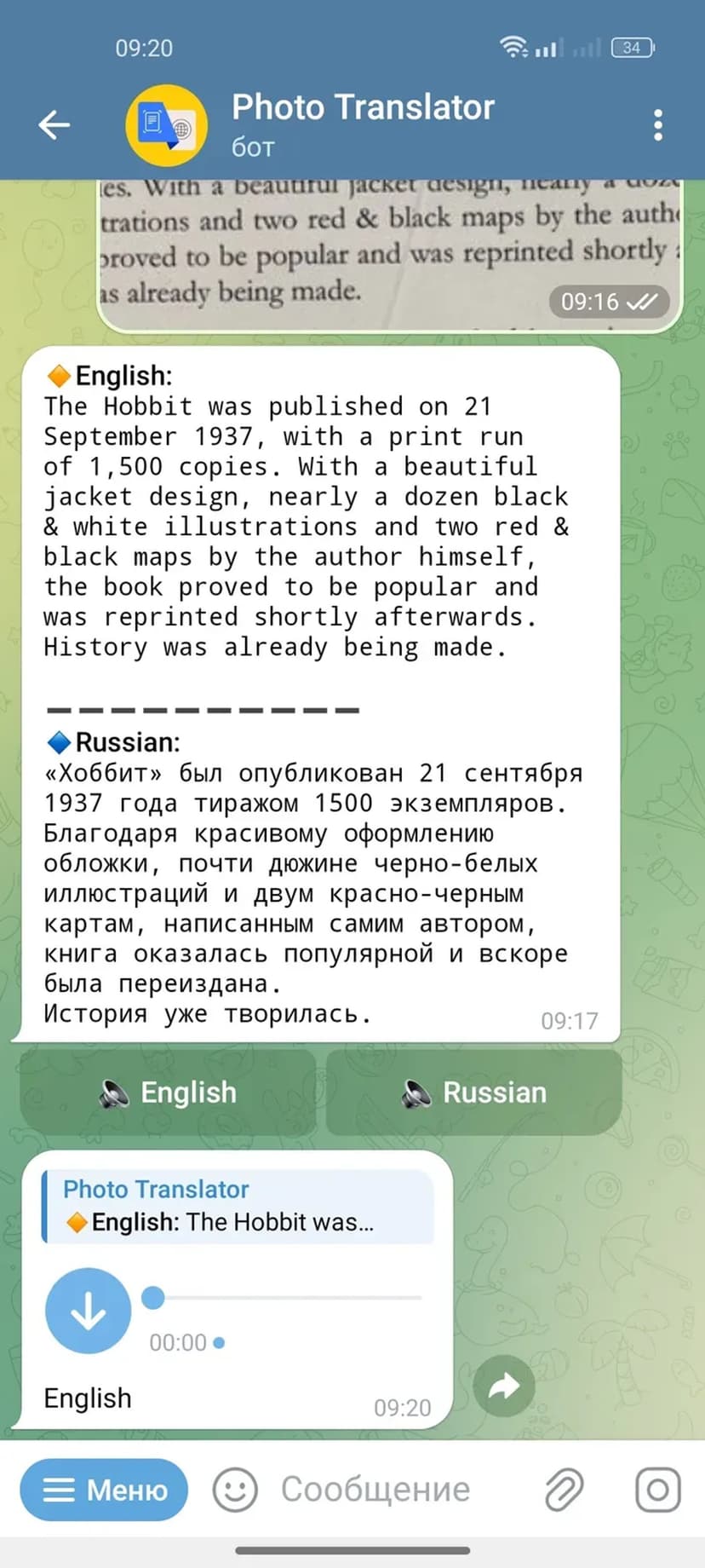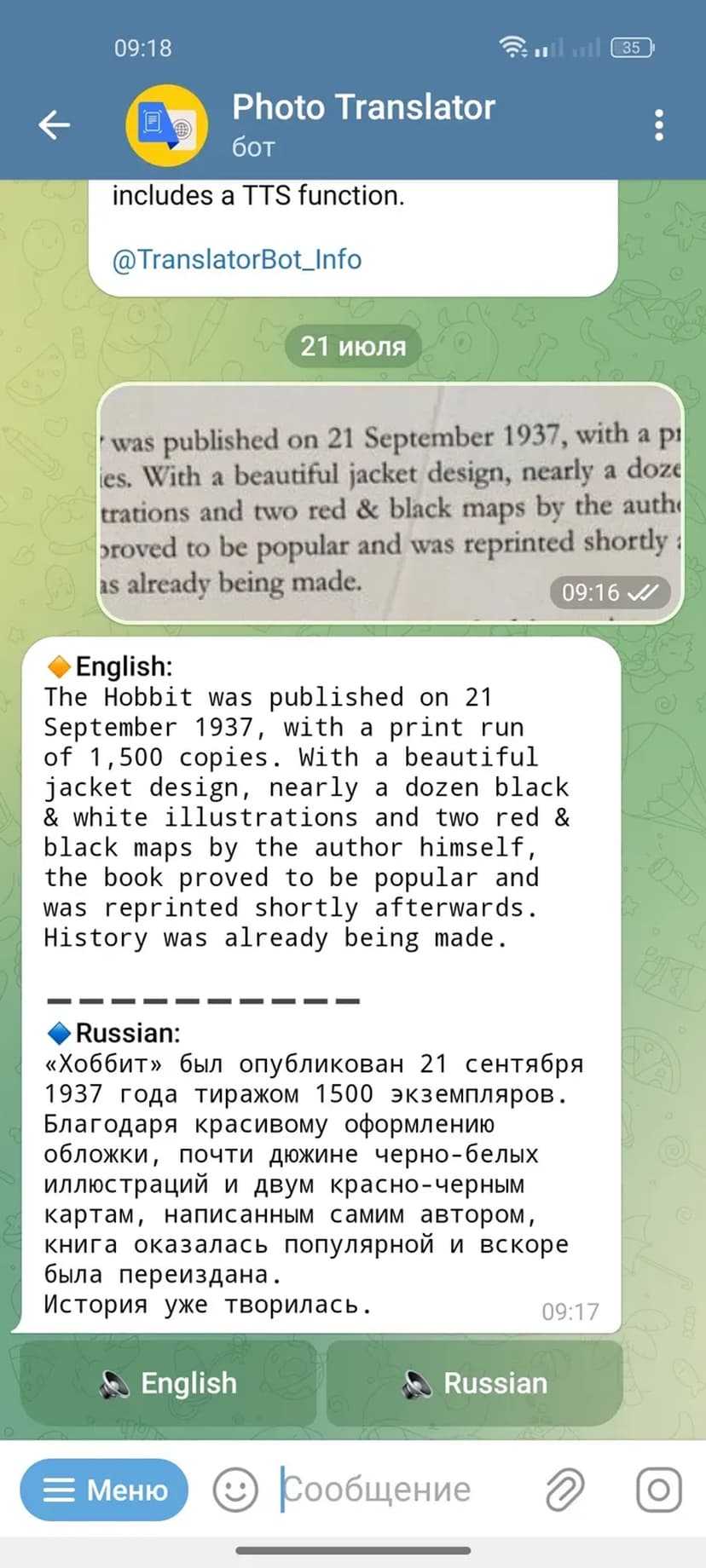 Photo Translator мгновенно извлекает текст с фотографий и изображений с помощью оптического распознавания (OCR) и возвращает распознанный текст прямо в чат.