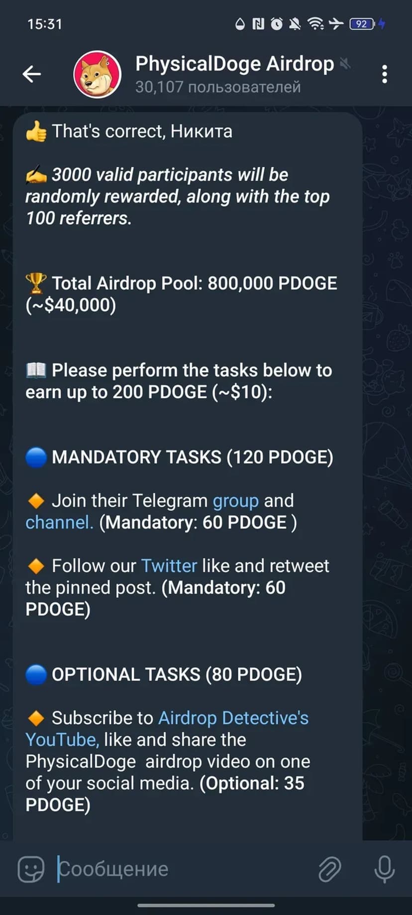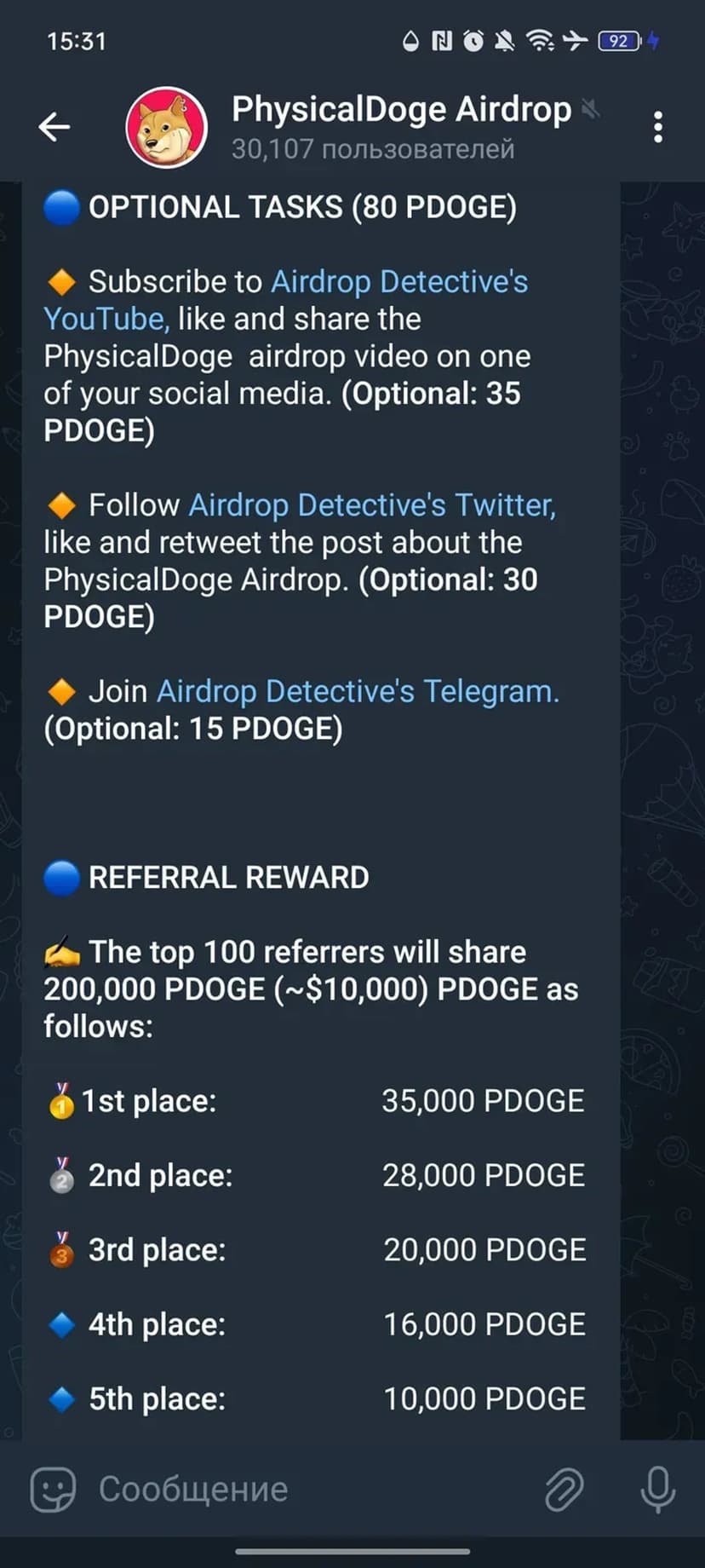 PhysicalDoge Airdrop — бот для участия в розыгрыше токенов PDOGE. Пользователи получают шанс на бесплатные токены за выполнение простых заданий и за вовлечение друзей.