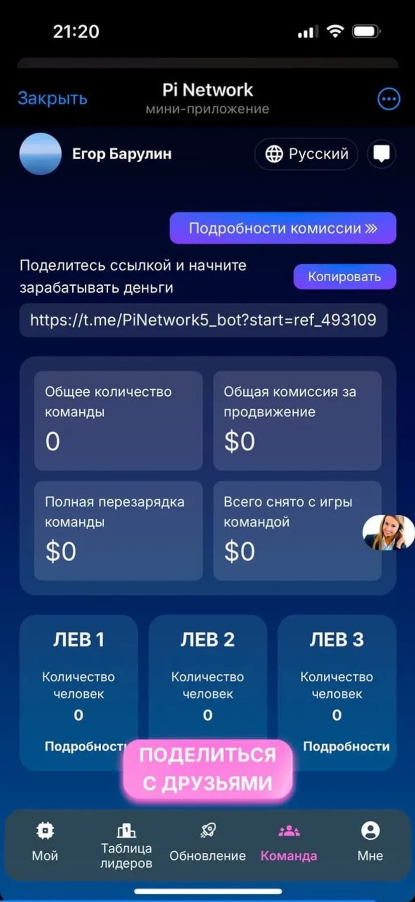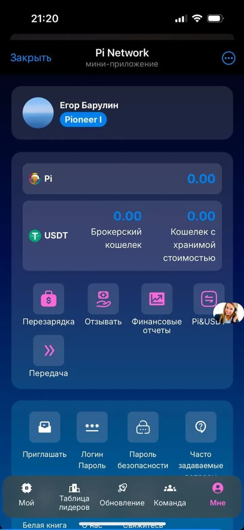 Подключение осуществляется через Telegram: пользователь запускает бота и начинает накопление Pi. Дополнительные возможности — выполнение небольших заданий и привлечение друзей в команду, что повышает скорость добычи. Накопленные Pi можно обменять на USDT через встроенные инструменты.