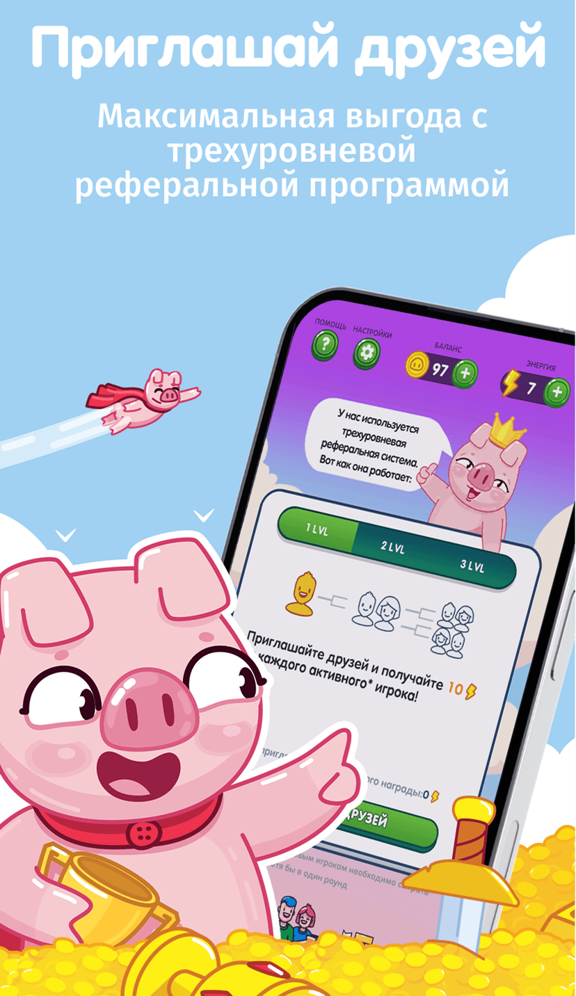- Трёхуровневая реферальная система: приглашённые пользователи приносят дополнительную энергию для игры.