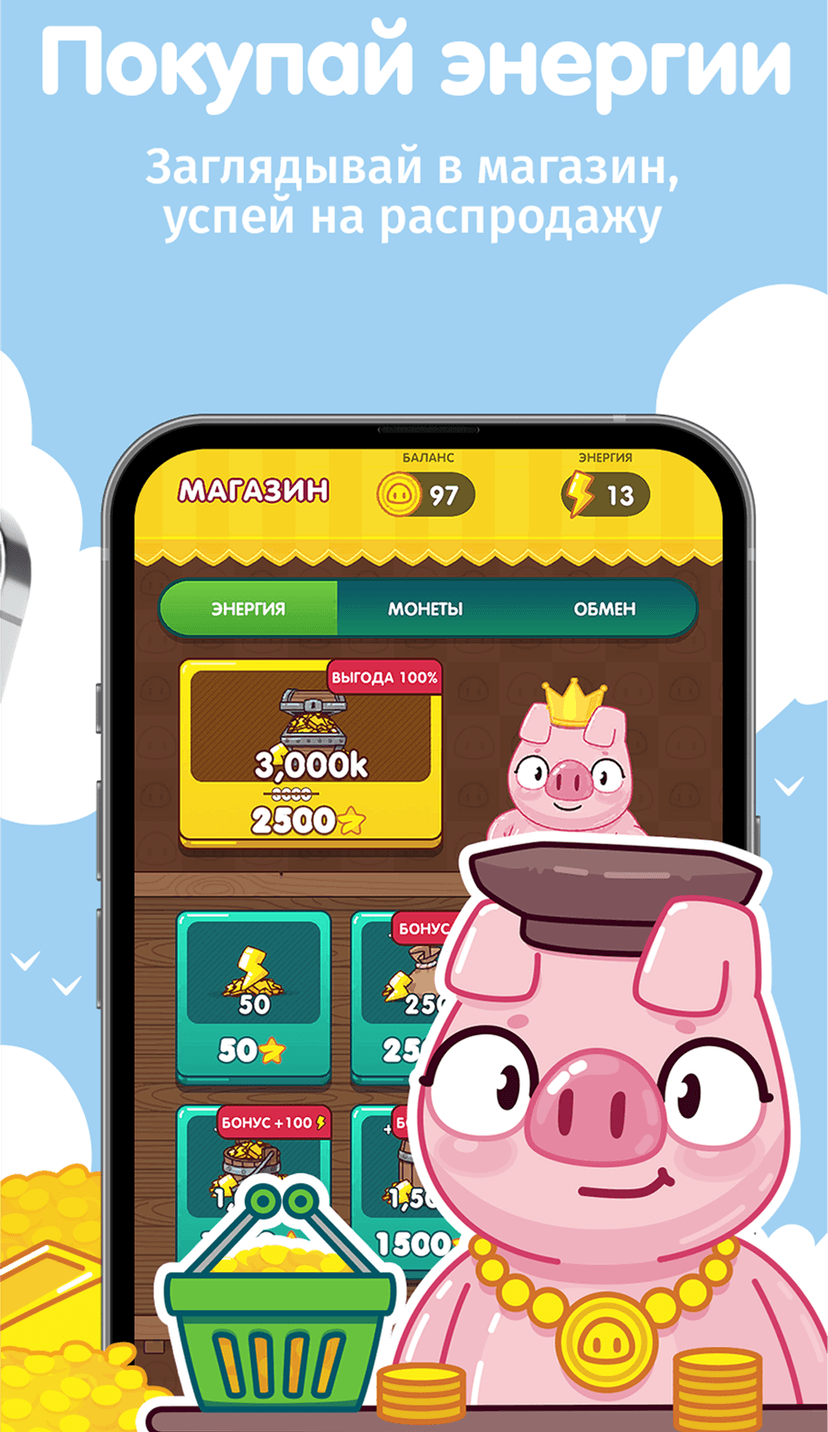- Кликер: основной геймплей строится вокруг нажатий по свинке для получения монет.