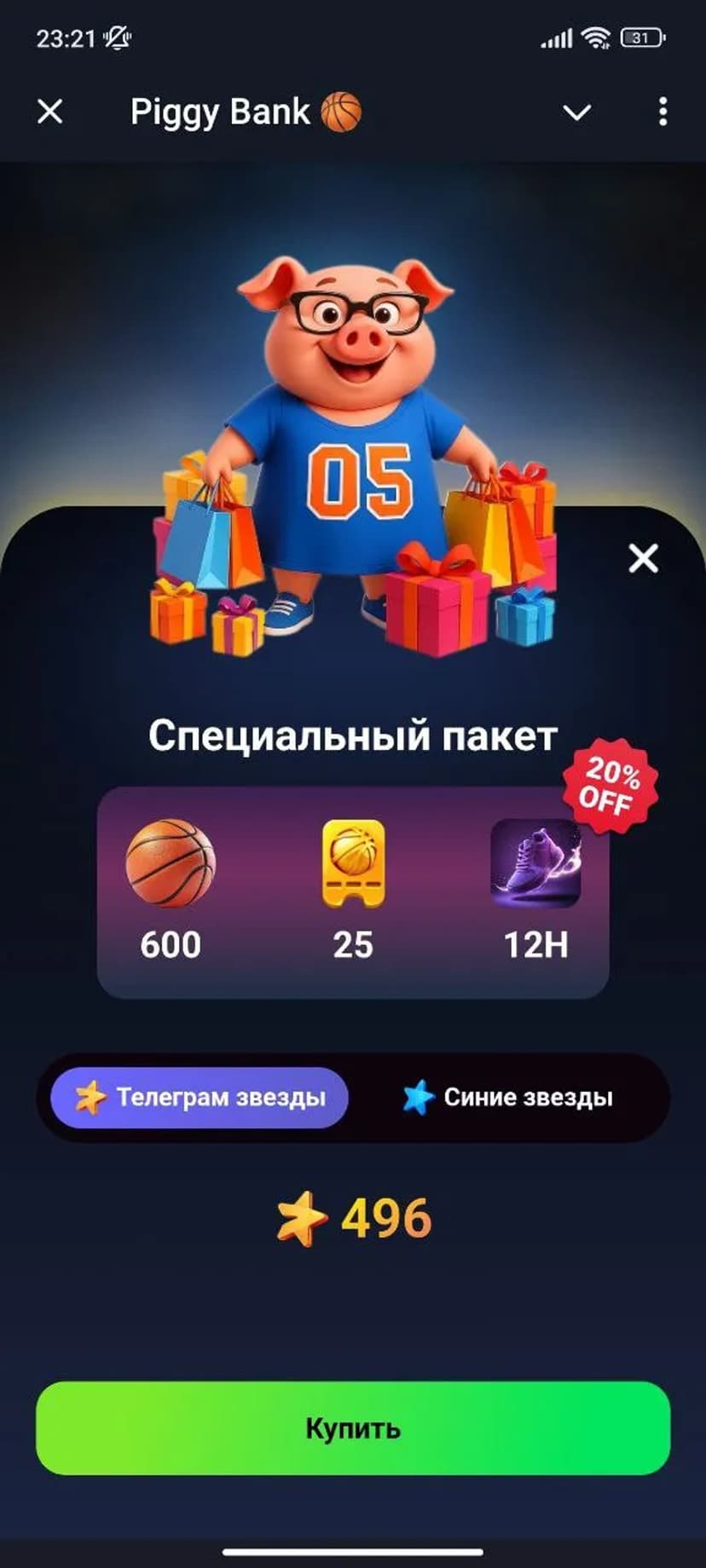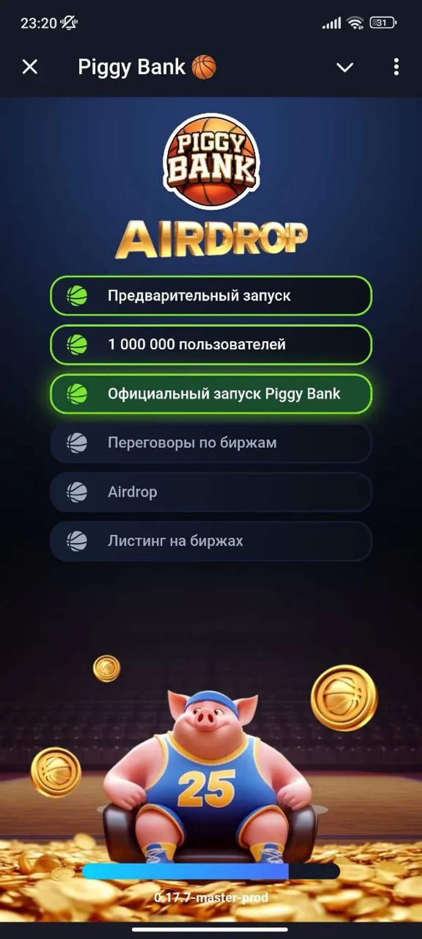 Piggy Bank 🏀 — азартная Airdrop-тапалка с баскетбольной стилистикой. Нажимая на мяч, игроки зарабатывают внутриигровую валюту BALLS, формируют команды и готовятся к будущему листингу токена.