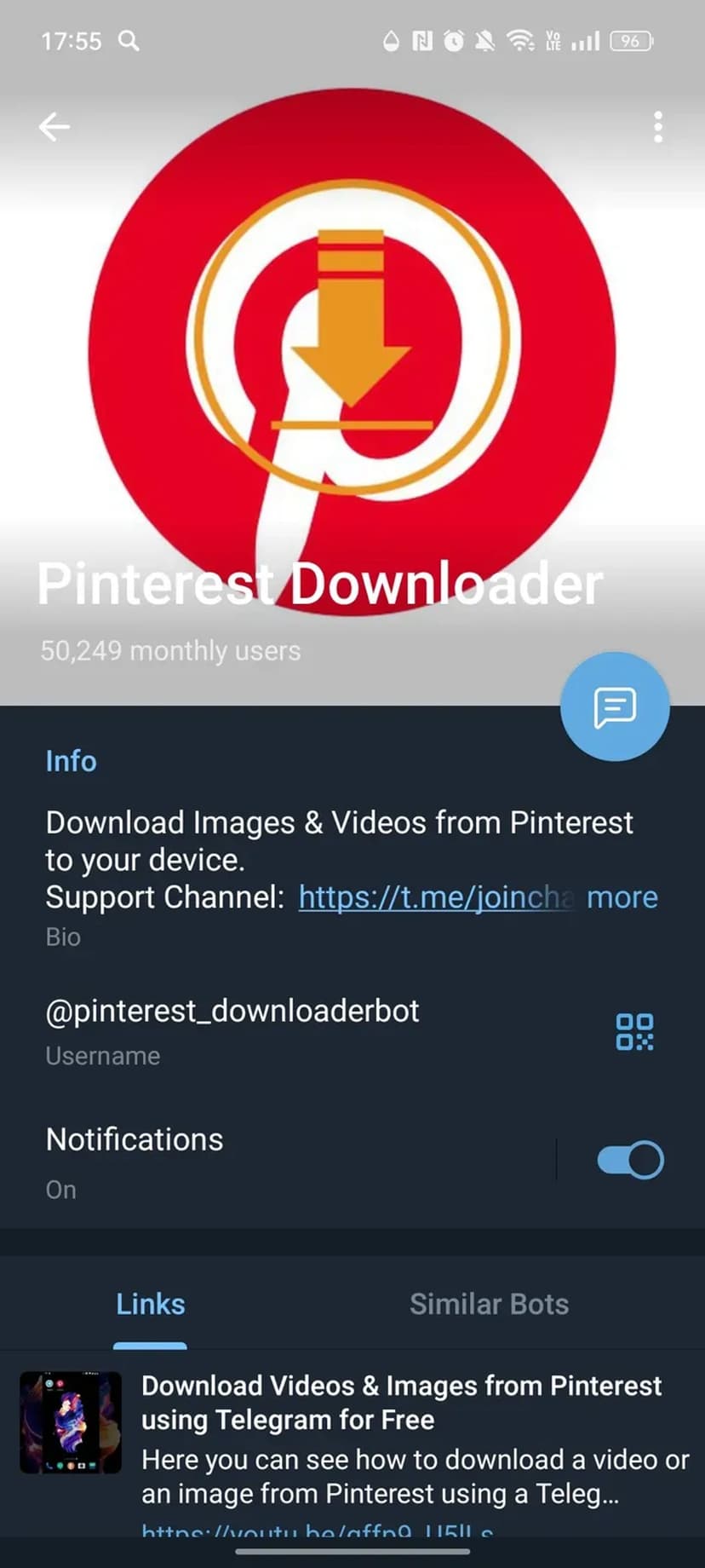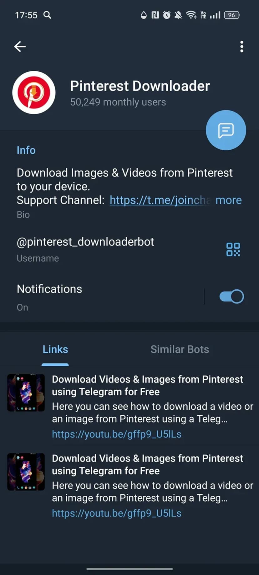 - Как работает: отправьте ссылку на нужный пин в чат с ботом — через короткое время вы получите файл в ответ.