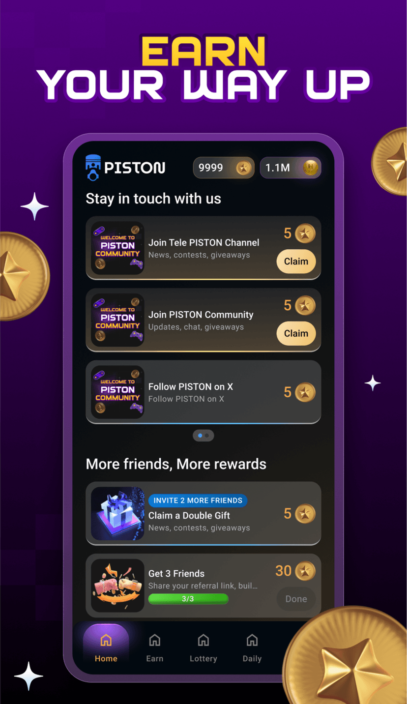 Piston Hub — Tap-to-earn платформа, объединяющая кликерную добычу токенов, сообщество по интересам и механику meme‑коинов. Пользователи зарабатывают внутриигровую валюту через нажатия и выполнение игровых заданий, а взаимодействие в чатах поддерживает активную экосистему.