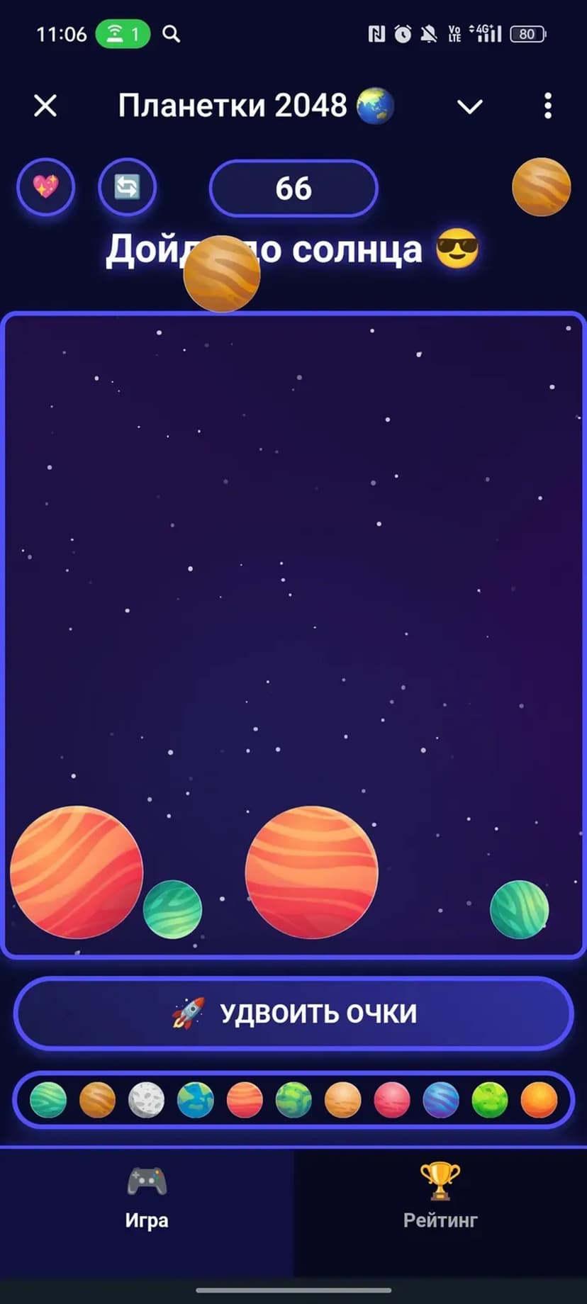 Планетки 2048 — логическая головоломка в духе 2048 с космической тематикой: игрок соединяет одинаковые кружочки-планеты, чтобы получить более крупные объекты и в конечном счёте создать Солнце. Игра прерывается, если игровое поле переполняется.