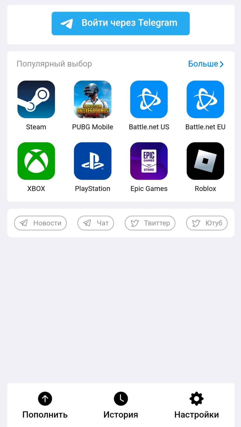 Пополнение баланса Steam, PS, Xbox, Epic, Roblox и др. через TON. Авторизация — через Telegram.
