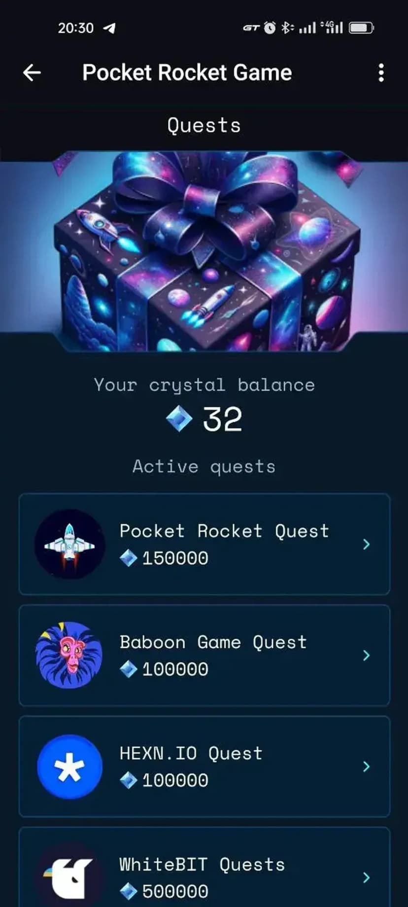 Pocket Rocket Game — космическая игра внутри мессенджера: добывайте кристаллы, развивайте флот и сражайтесь за редкие цифровые предметы.
