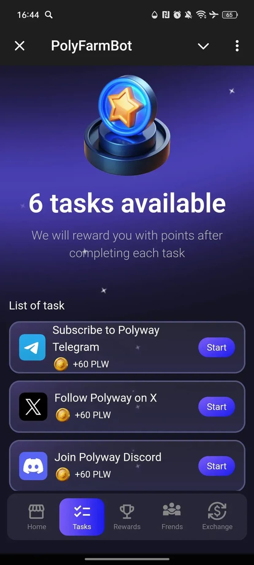 PolyFarmBot — бот, интегрированный с экосистемой Polyway, который позволяет зарабатывать PLW‑поинты и обменивать их на токены без выхода из Telegram.