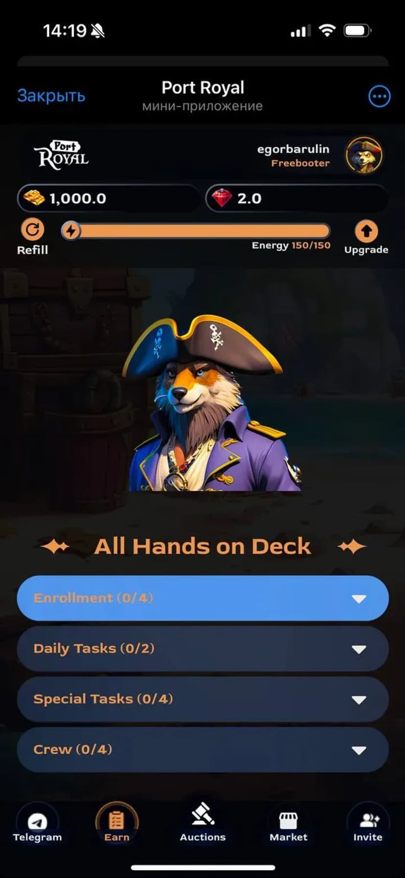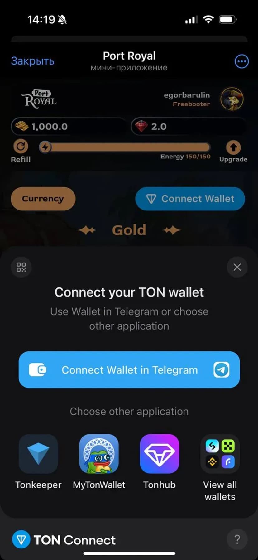Port Royal предназначен для совершеннолетних пользователей, у которых есть поддерживаемый TON-кошелёк. Приложение не поддерживает сторонние мессенджеры или внешние платформы — доступ возможен только через мини‑приложение в Telegram.