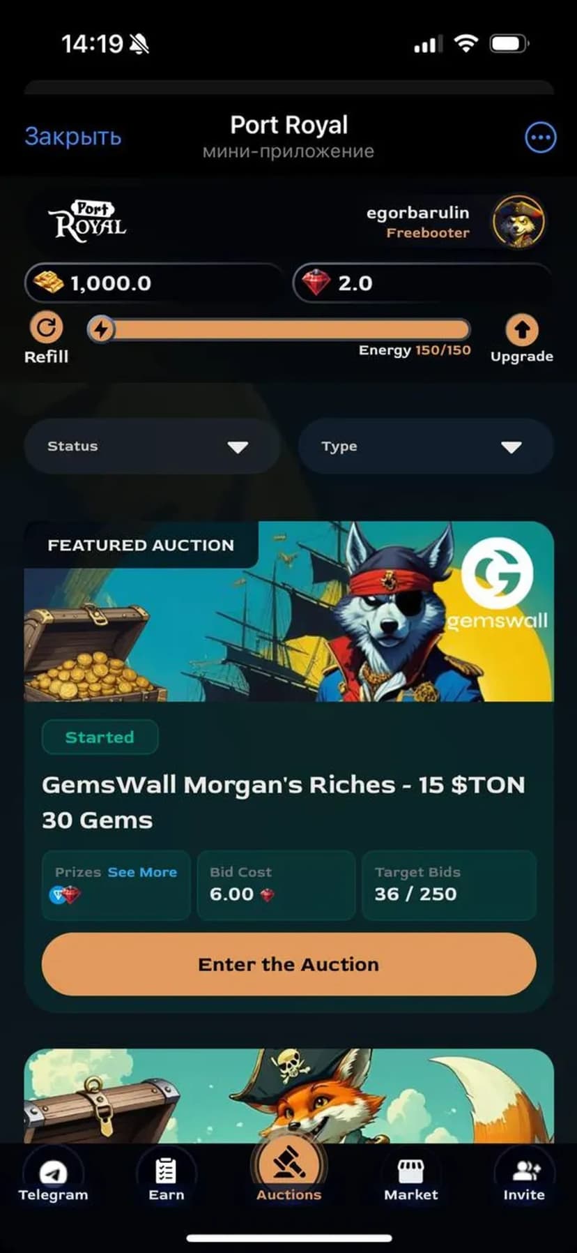 Port Royal — пиратская площадка-аукцион на базе TON: участвуйте в торгах в реальном времени, просматривайте активные лоты, делайте ставки и выигрывайте коллекционные предметы, расчёт которых ведётся в игровой валюте TON.