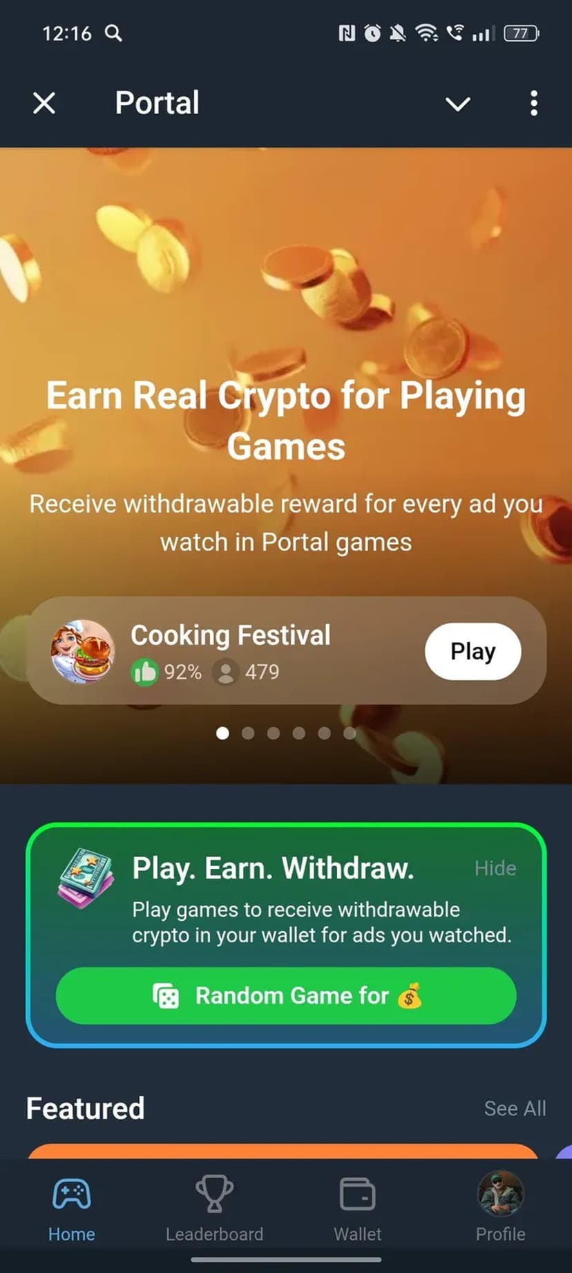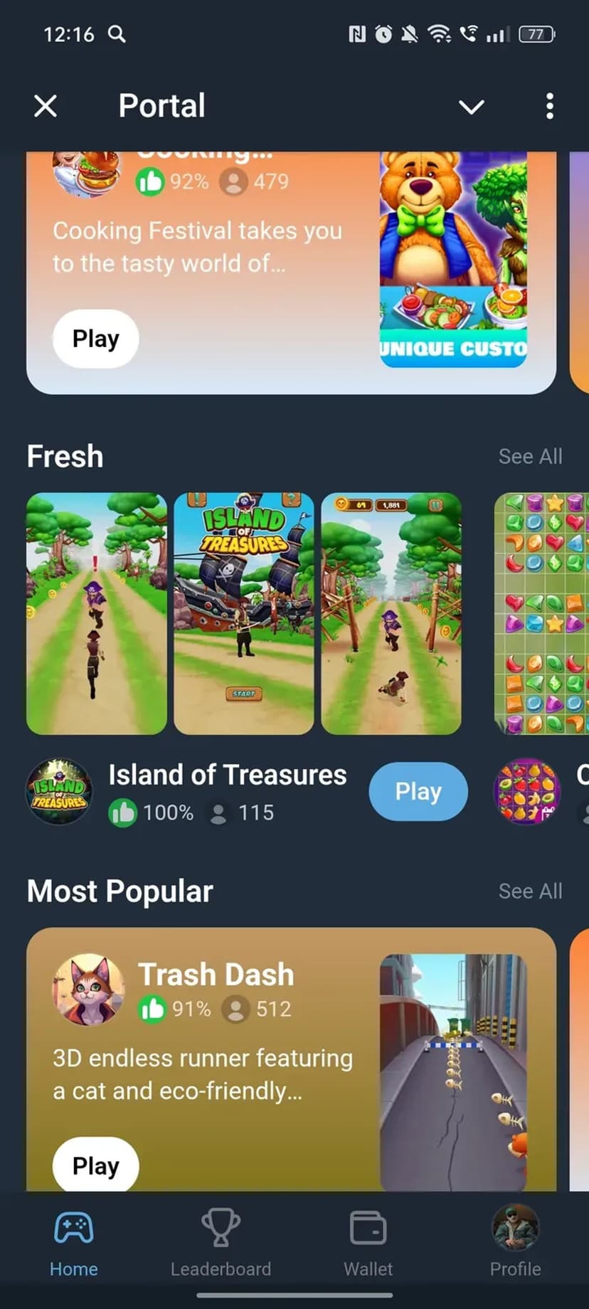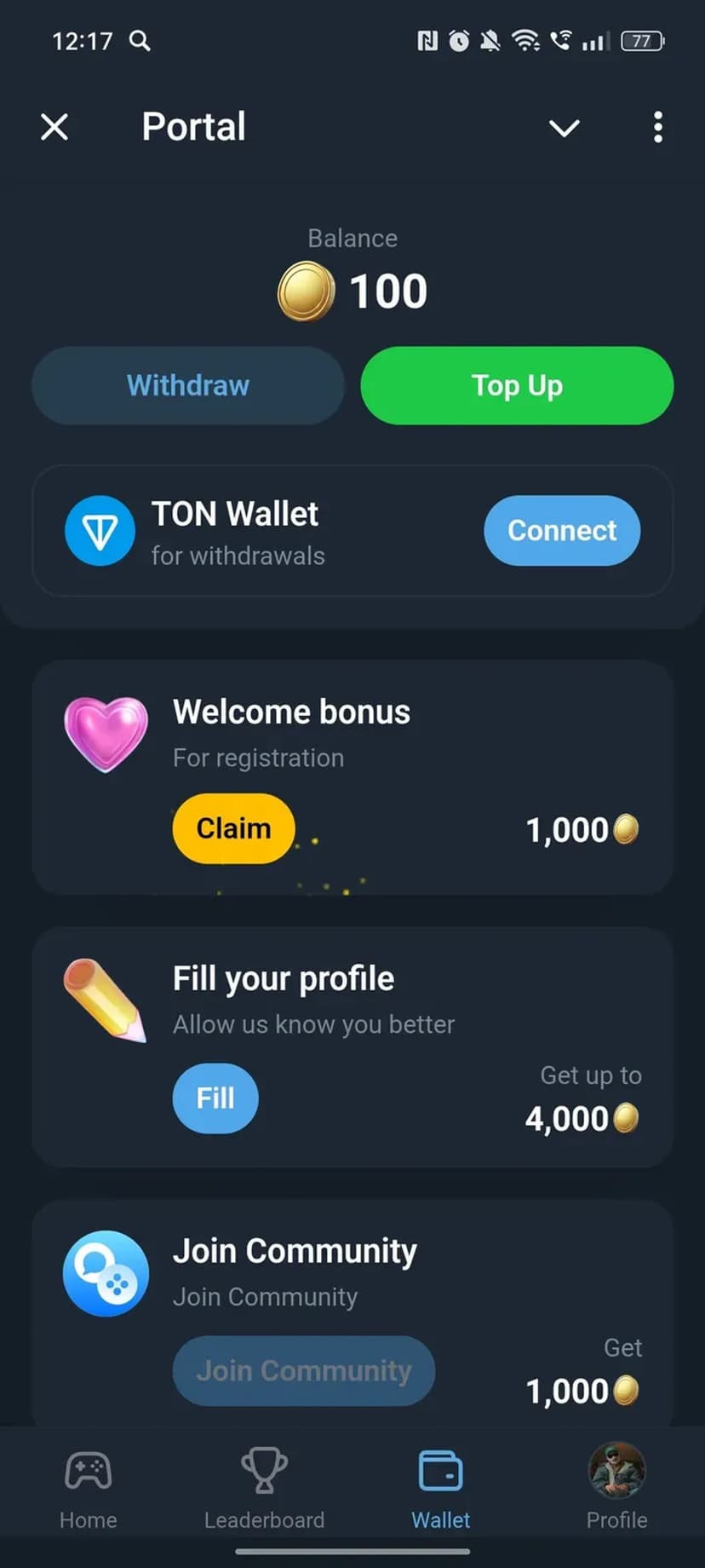 Portal Games объединяет более 10 игр, которые запускаются внутри Telegram через Web Apps API и позволяют получать реальные деньги за игровые сессии. Сервис работает без установки дополнительных приложений — все игры открываются в интерфейсе мессенджера.