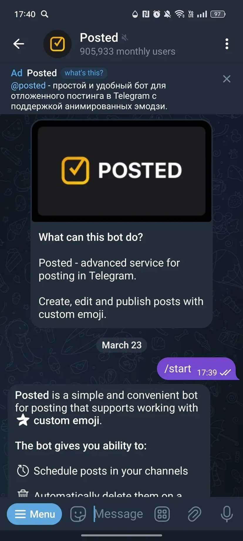 Технически Posted работает как бот‑ассистент внутри Telegram, не требует внешней интеграции и поддерживает работу с несколькими каналами одновременно. Подходит администраторам каналов, SMM‑специалистам и авторам, которым важна скорость и удобство управления публикациями.