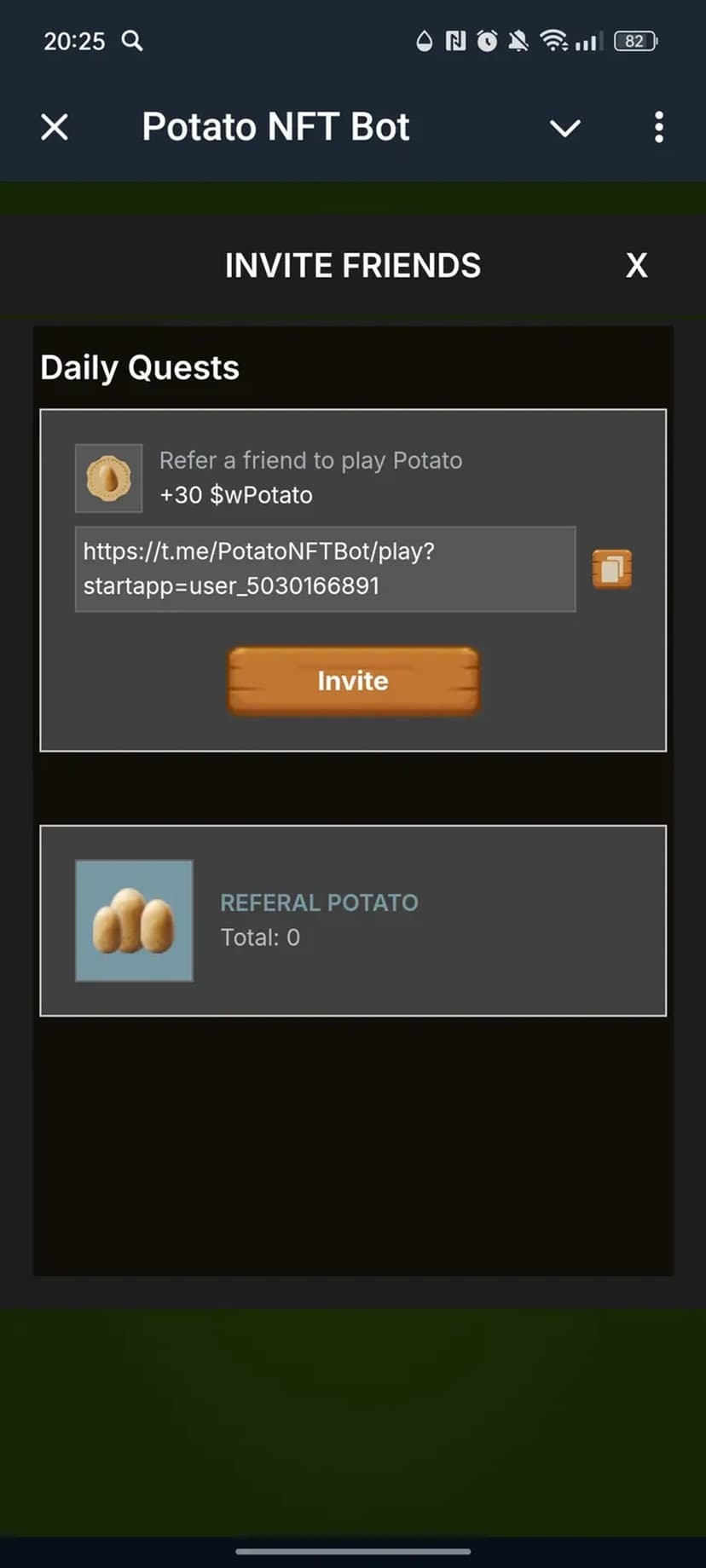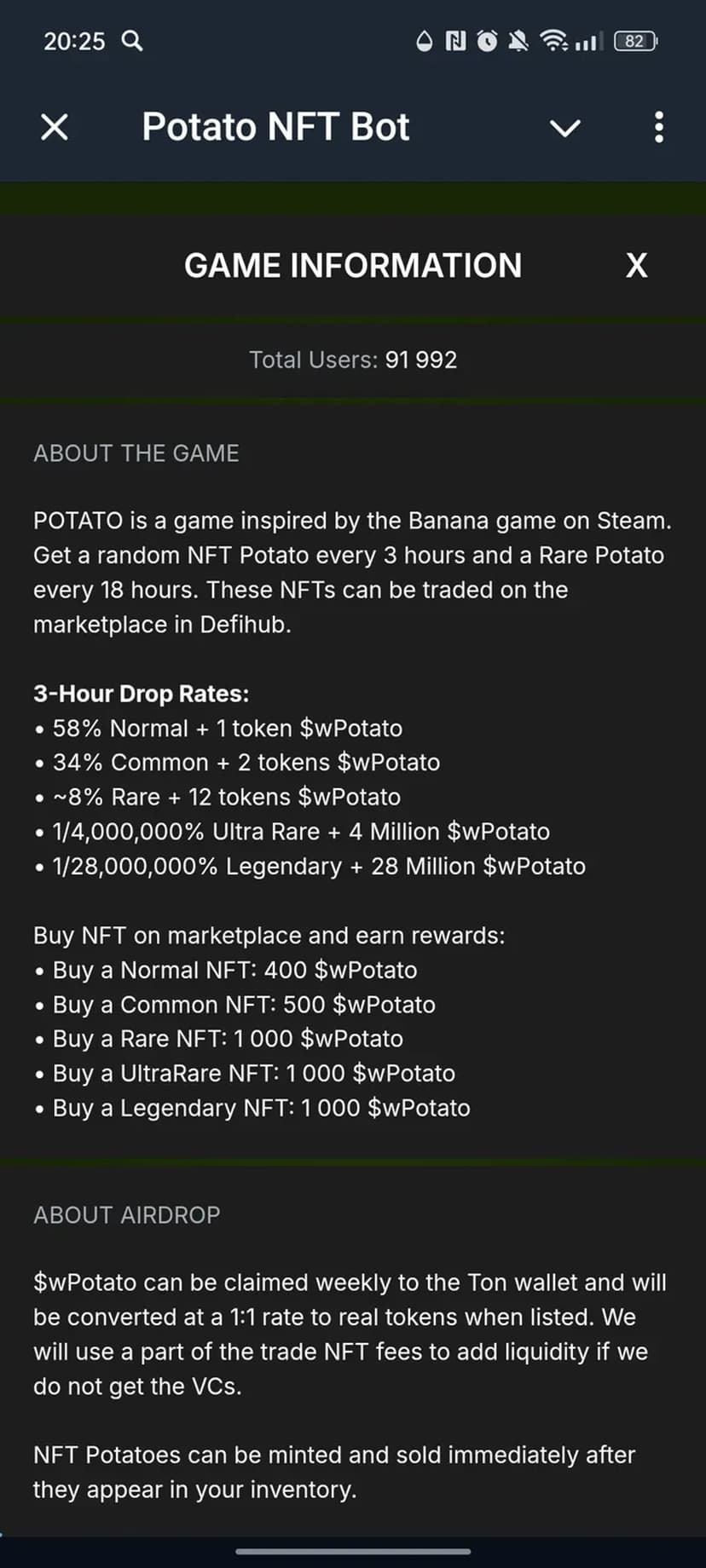Potato NFT Bot предоставляет простой способ получать, коллекционировать и торговать NFT внутри Telegram через регулярные вознаграждения за активность. Механика ориентирована на частые награды без сложных игровых механик, а полученные NFT можно монетизировать на интегрированном маркетплейсе.