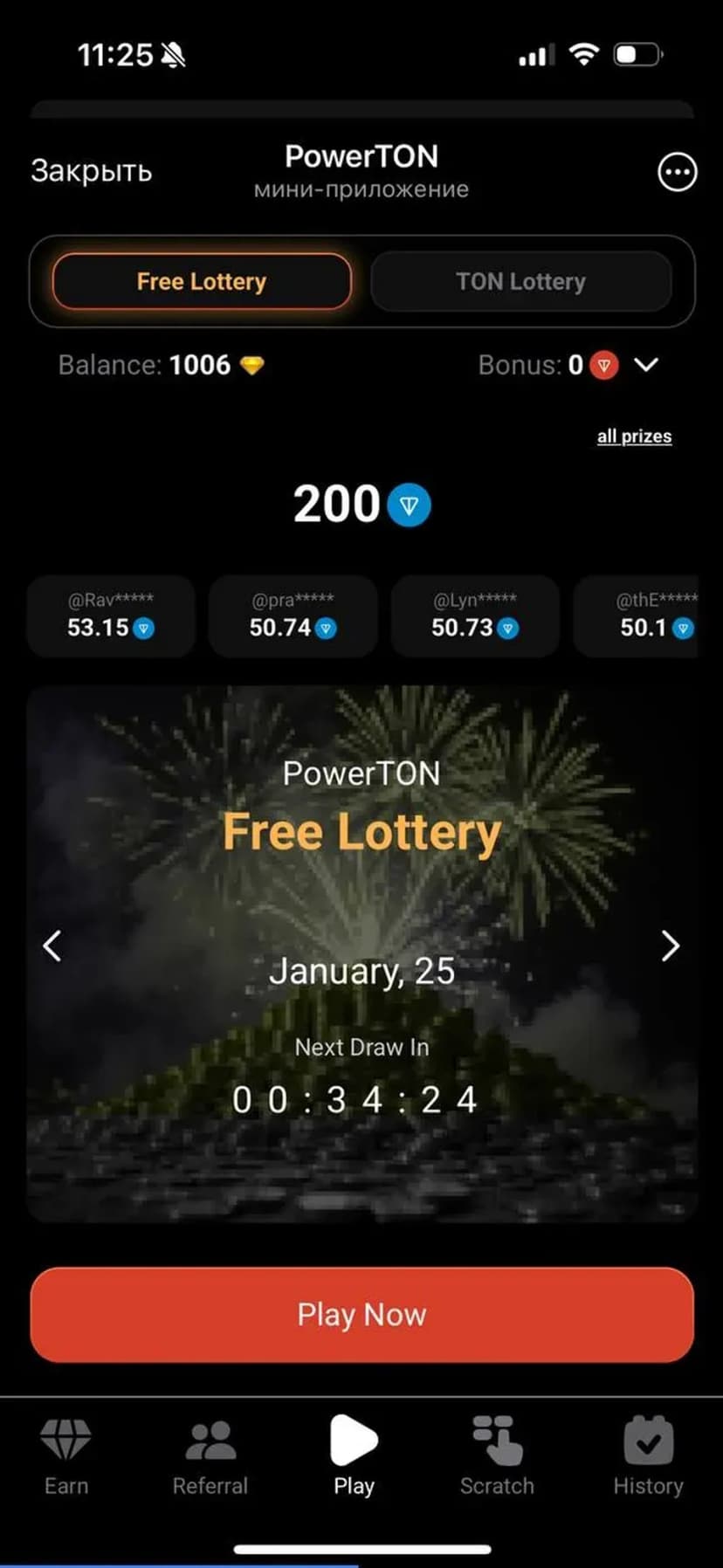 PowerTON — децентрализованная и прозрачная лотерея с поддержкой Bitcoin, полностью работающая внутри Telegram. Участвуйте в розыгрышах, используйте бесплатные или премиальные билеты и получайте криптовалютные джекпоты с мгновенными выплатами на внутренний кошелёк. Все результаты формируются на основе Web3-технологий, что обеспечивает открытость и возможность независимой проверки.