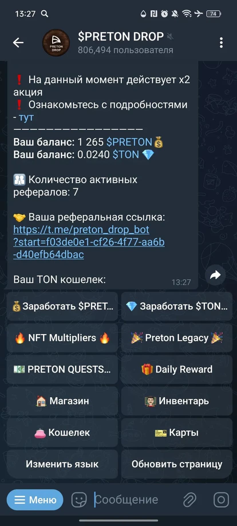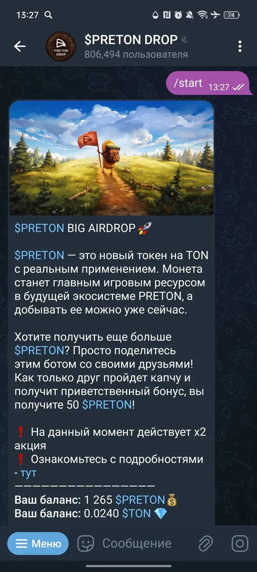 Участие в airdrop’e $PRETON на TON: получение токенов, отслеживание баланса и реферальные награды