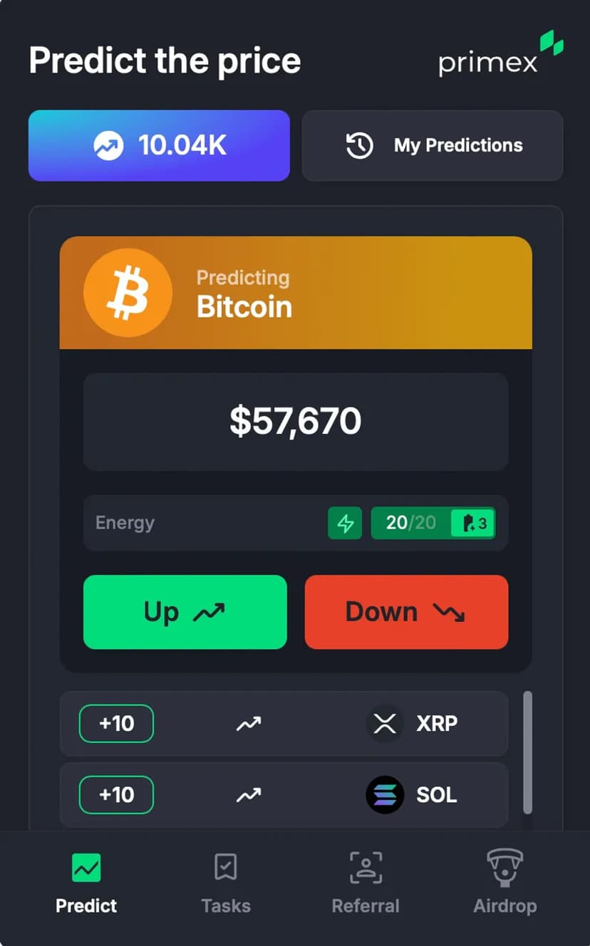 Primex PricePulse — игра от команды Primex Finance для прогнозирования движения цен цифровых активов. Делайте ставки «выше/ниже», получайте очки за точные предсказания и повышайте своё место в личном рейтинге.