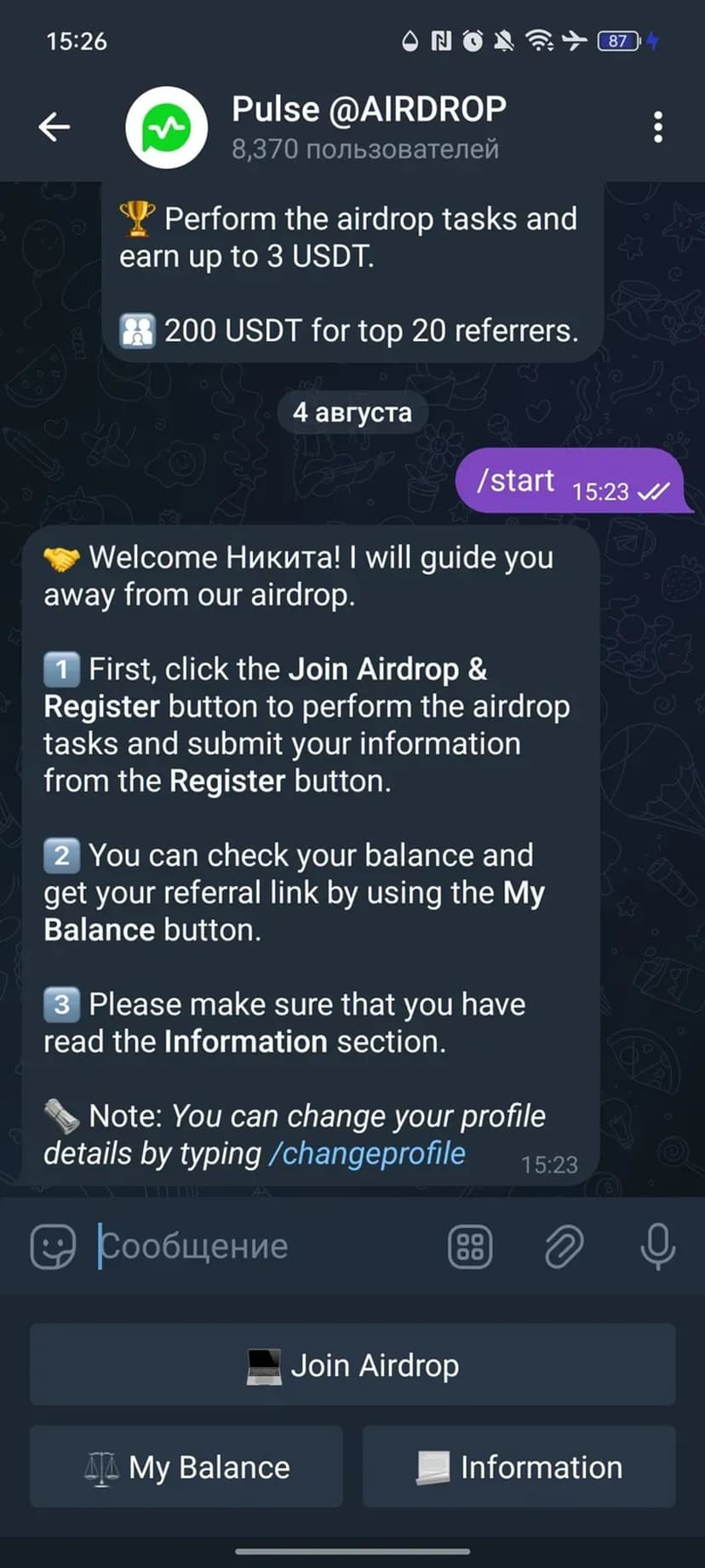 *Нажимая "Открыть в Telegram", вы перейдете к приложению Pulse @AIRDROP в мессенджере Telegram