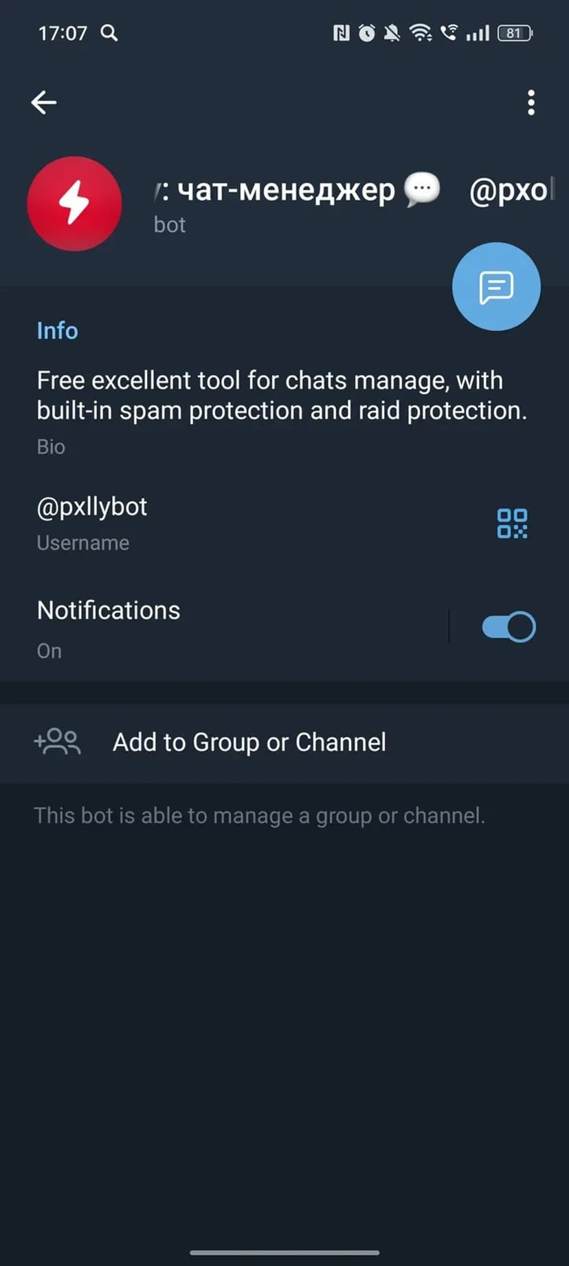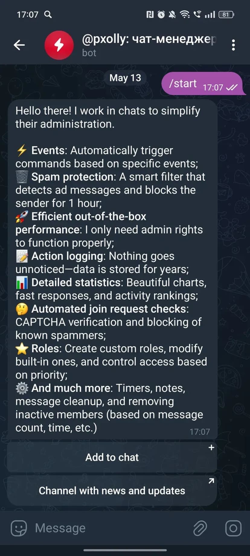 pxolly — чат‑менеджер, который упрощает управление группами и чатами. Сервис рассчитан на администраторов: работает быстро, без рекламы, с понятным интерфейсом и доступом через простые команды. Требует прав администратора для полноценной работы.