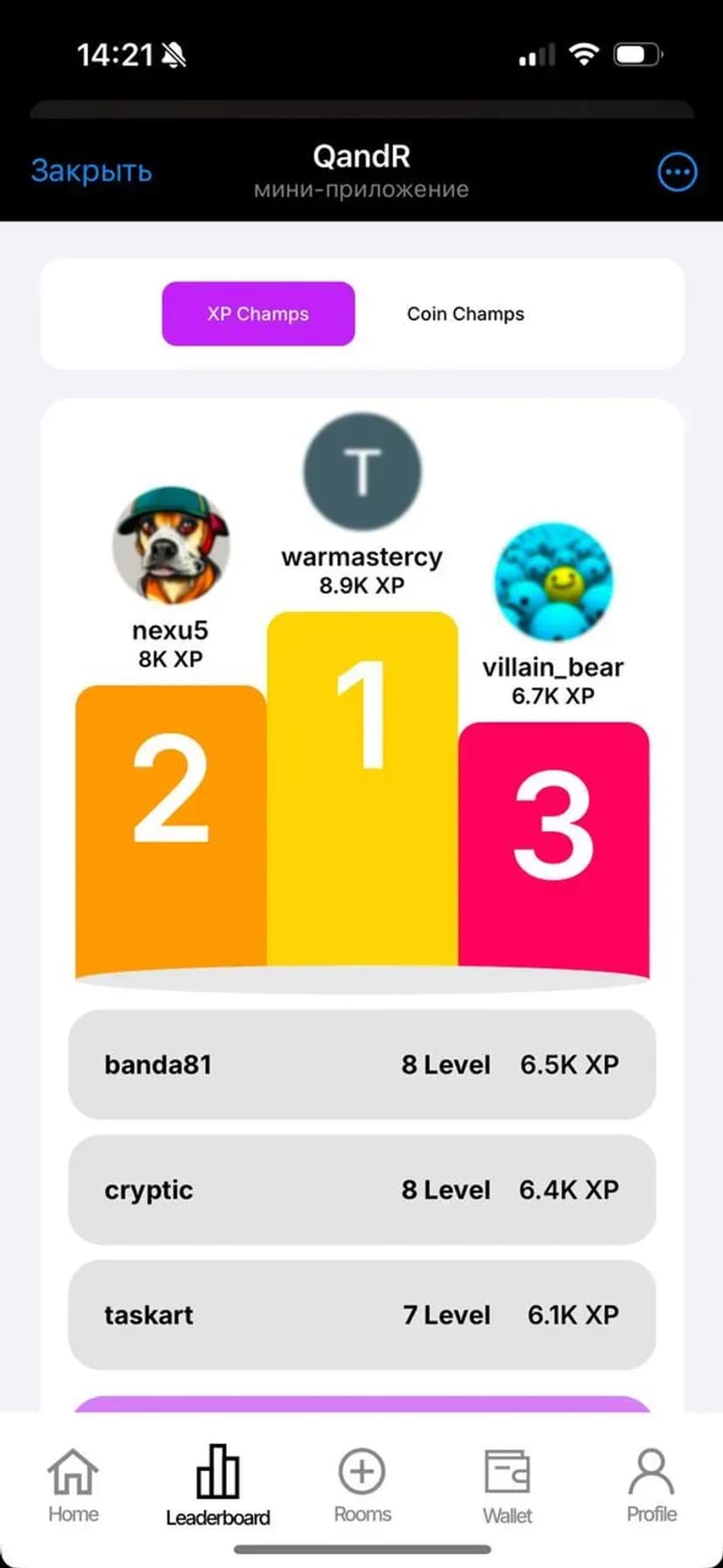 QandR — живая платформа викторин по Web3 и криптовалютам. Участники быстро отвечают на вопросы, получают баллы и борются за места в общем лидерборде, который обновляется в реальном времени.