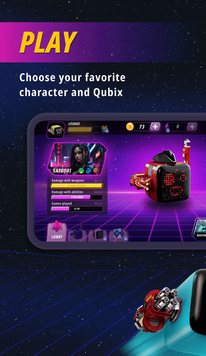 Qubix Arena — мобильный PvP онлайн‑шутер, доступный в формате мини‑приложения внутри Telegram и на мобильных платформах. Сразу после запуска можно выбрать персонажа с уникальными умениями или управлять боевым роботом. Интерфейс выдержан в стиле современных мобильных игр: основной экран даёт быстрый доступ к матчам, настройкам, персонализации героя и списку достижений.