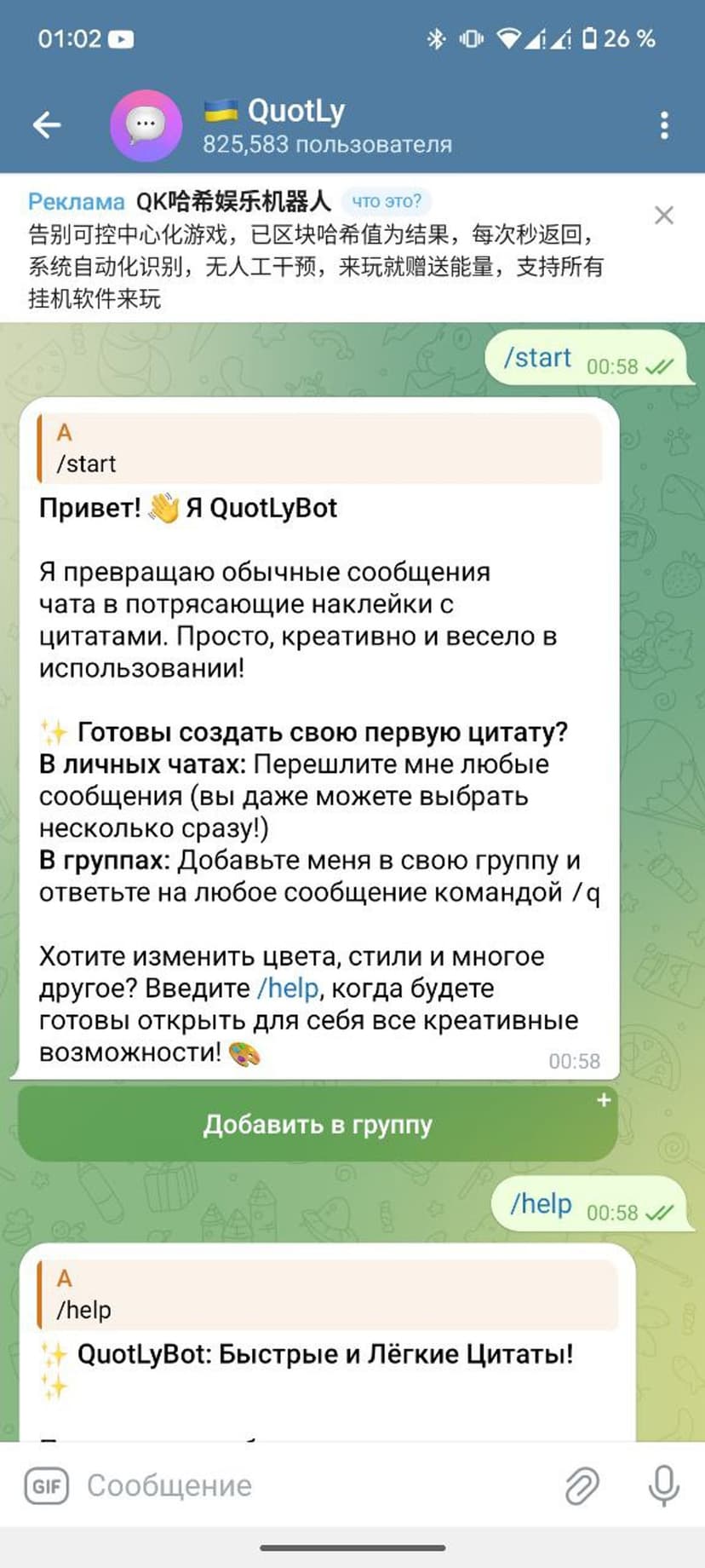 - Работа в личках и группах: поддерживается в личных чатах и в группах (требуется добавить бота в группу).