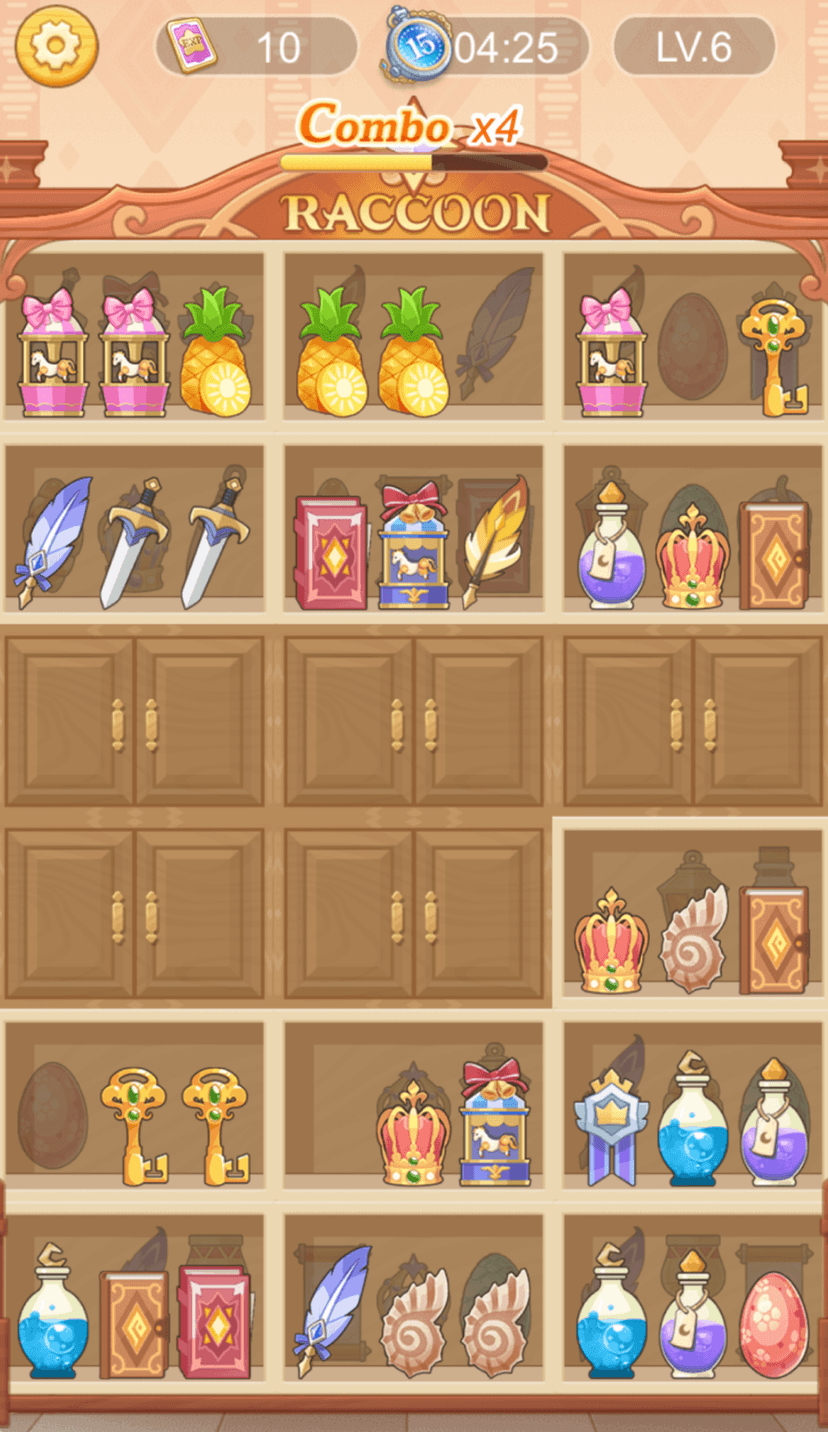 Raccoon — динамичная головоломка в жанре match-3: управляйте переполненным контейнером, быстро объединяйте одинаковые предметы по три и освобождайте место, чтобы получать монеты и опыт.