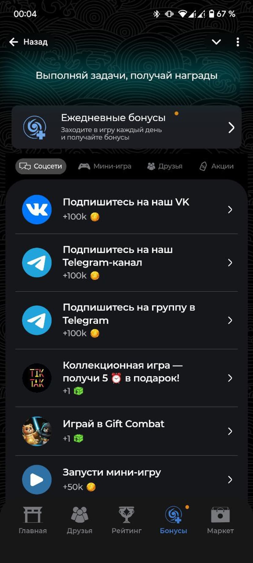 - Развитие и награды: прокачивай персонажей, выполняй задания и получай ежедневные бонусы.