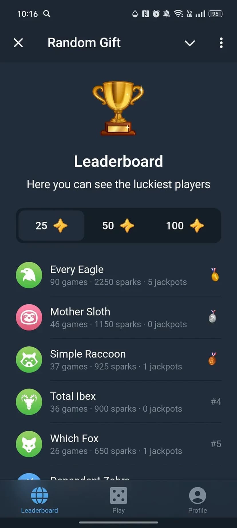 Random Gift предлагает мгновенные розыгрыши: за небольшую плату пользователь получает случайный подарок прямо внутри мессенджера. Сервис ориентирован на быстрые розыгрыши с мгновенной выдачей результатов и простым взаимодействием.