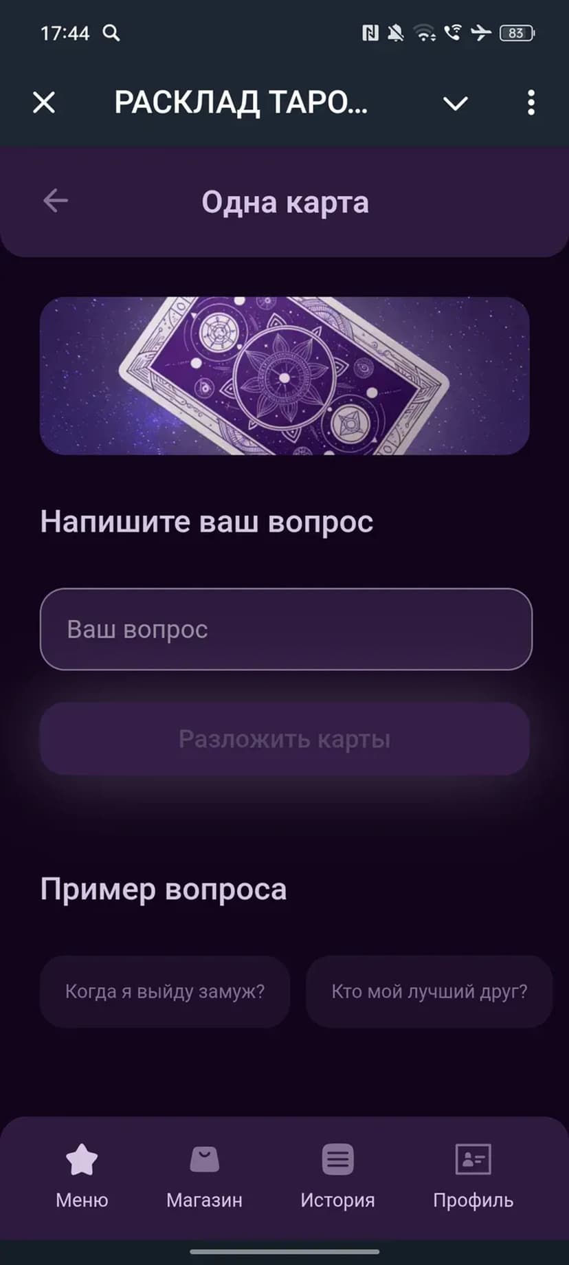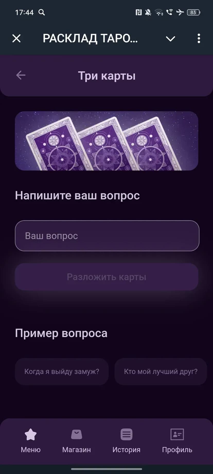 «РАСКЛАД ТАРО 🔮 ГАДАНИЕ ✨ ПРЕДСКАЗАНИЕ 🃏» выполняет автоматические расклады на картах Таро: задайте вопрос или укажите сферу жизни, выберите тип расклада и получите персональный результат с текстовой расшифровкой карт.