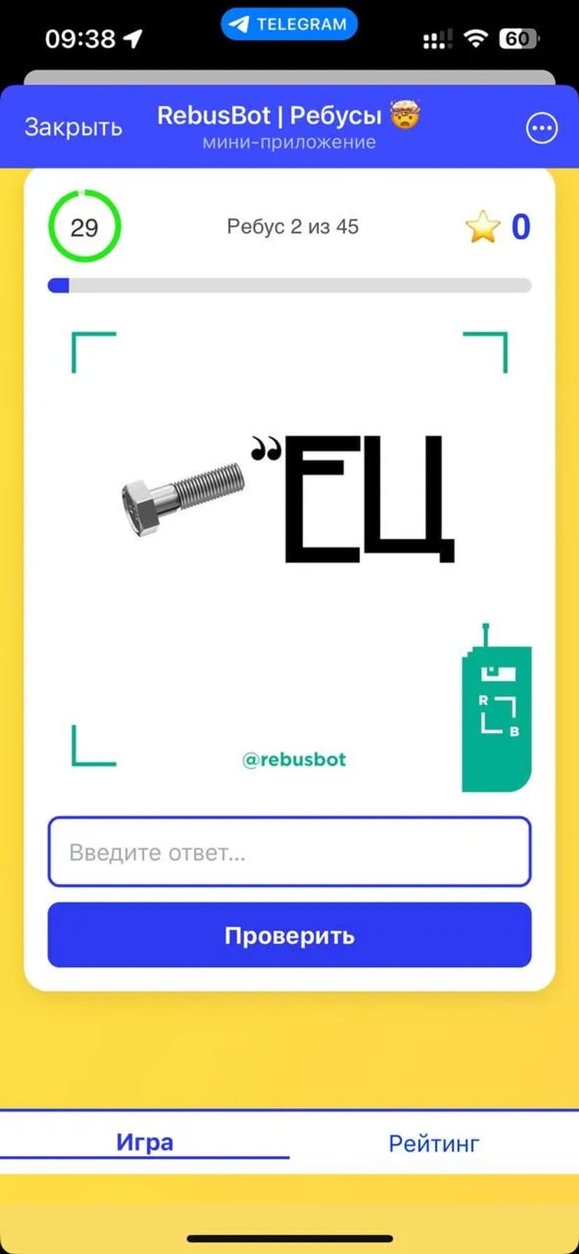 *Нажимая "Открыть в Telegram", вы перейдете к приложению RebusBot | Ребусы 🤯 в мессенджере Telegram
