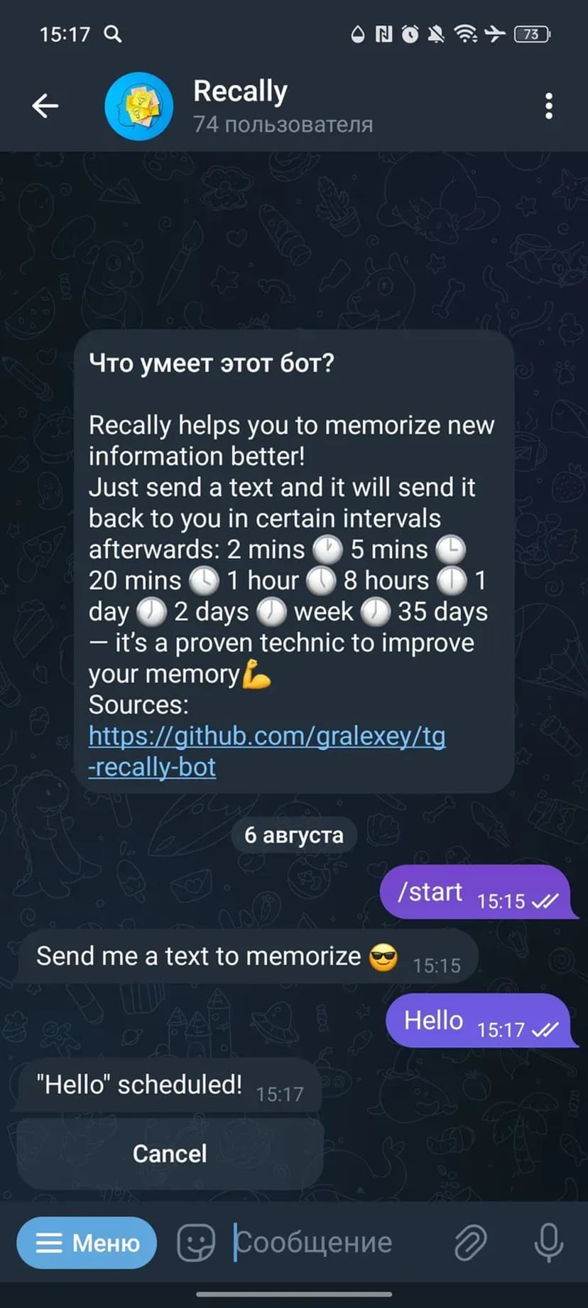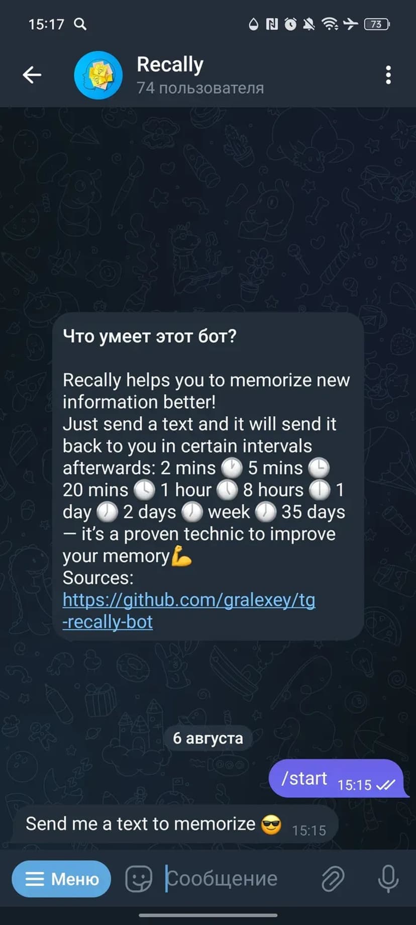 Recally помогает запомнить любые тексты с помощью интервального повторения: вы отправляете материал, а сервис периодически возвращает его для повторных просмотров и закрепления.
