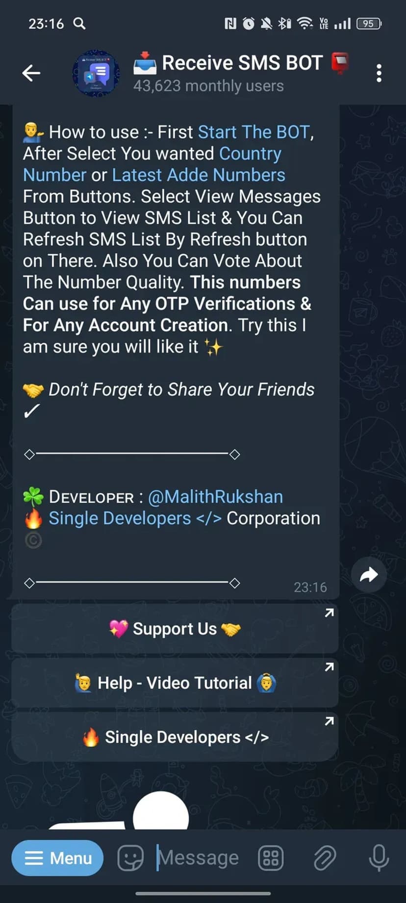 📥 Receive SMS BOT 📮 предоставляет доступ к временным номерам из более чем 10 стран для приёма SMS — удобно получать OTP, подтверждения регистрации и проверять работу сервисов, не указывая личный номер.
