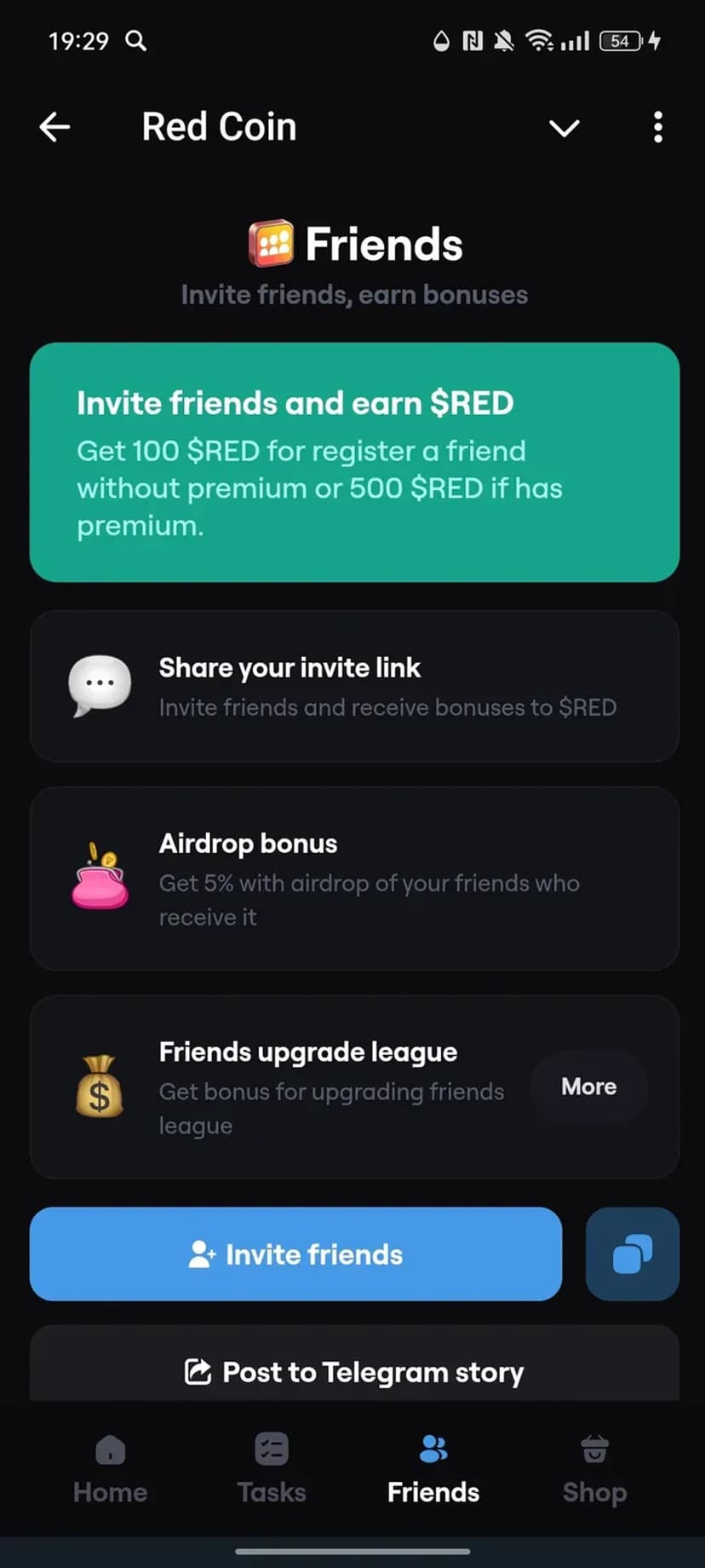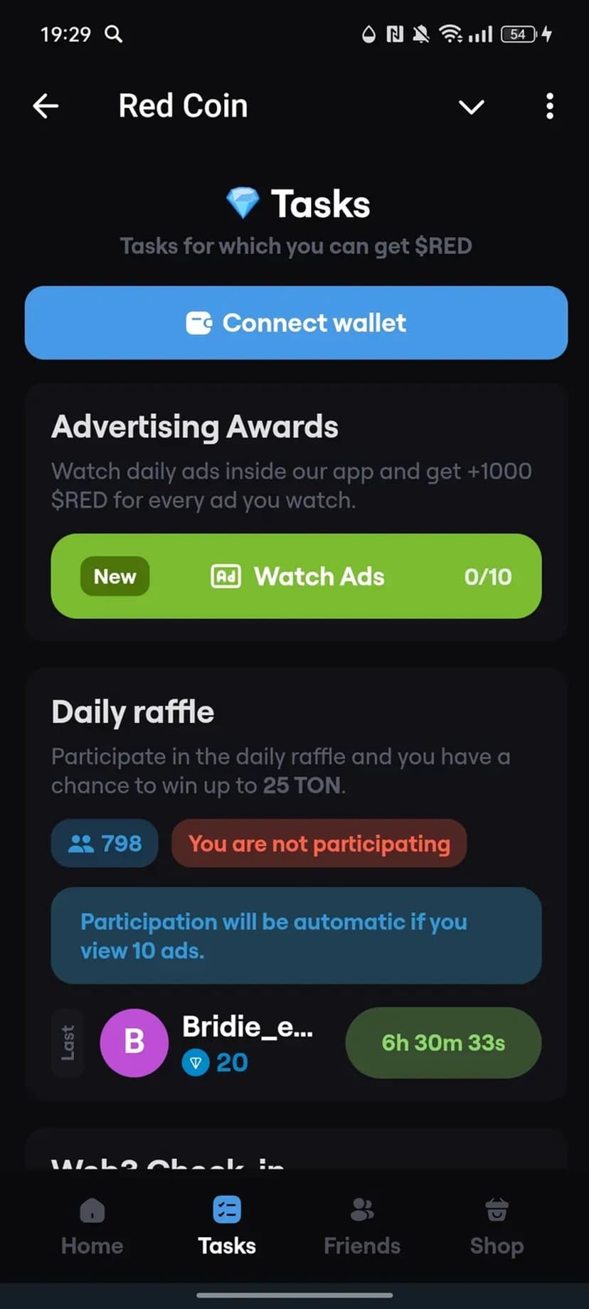 - Автоматический учёт выполненных заданий и начисление наград в токенах $RED и $TON.