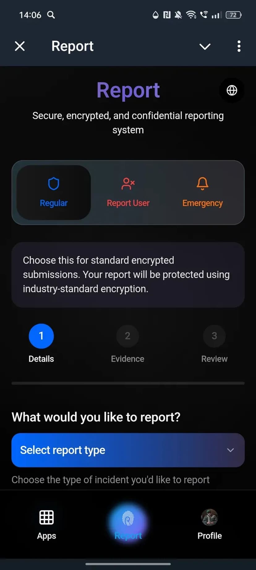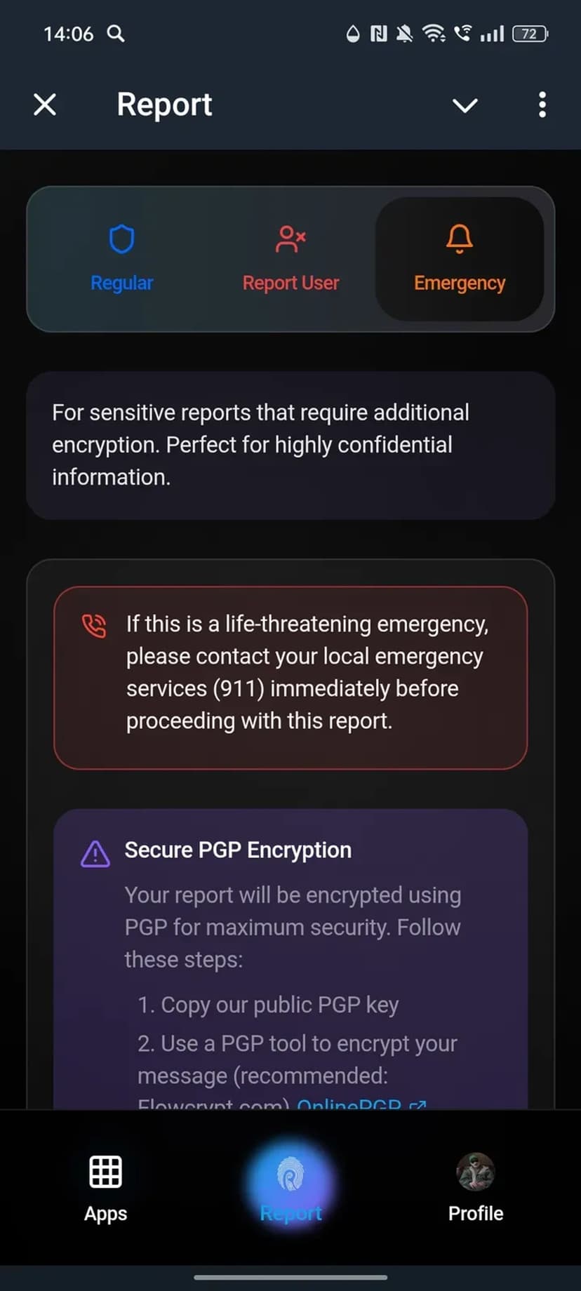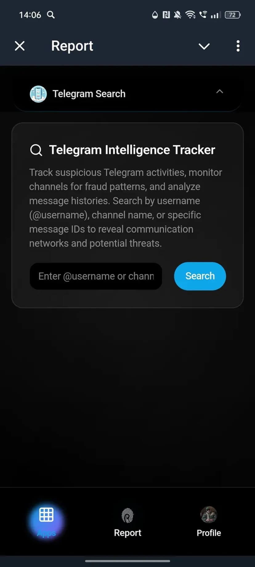 Report принимает анонимные сообщения о цифровых преступлениях (онлайн‑мошенничество, фишинг и др.) и позволяет прикреплять доказательства для проверки инцидентов.