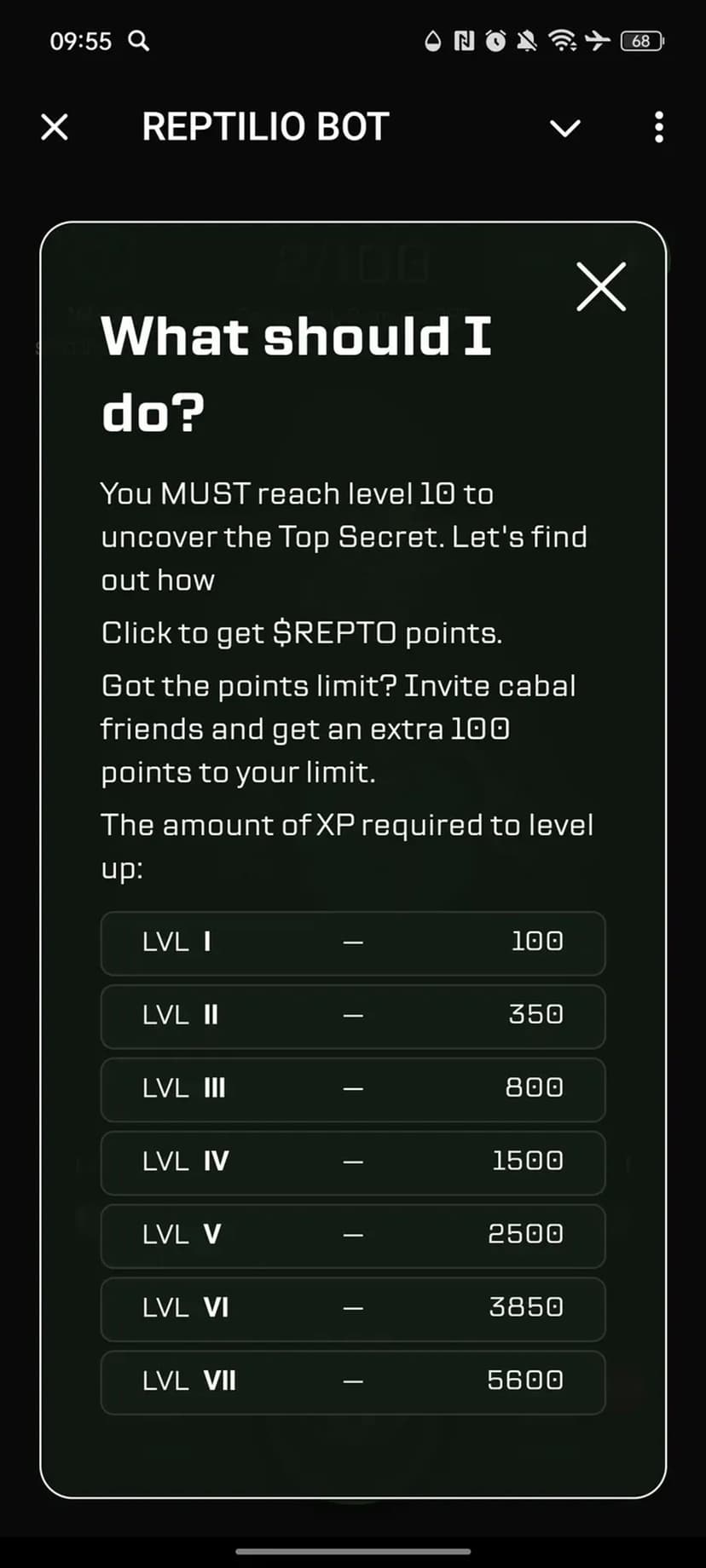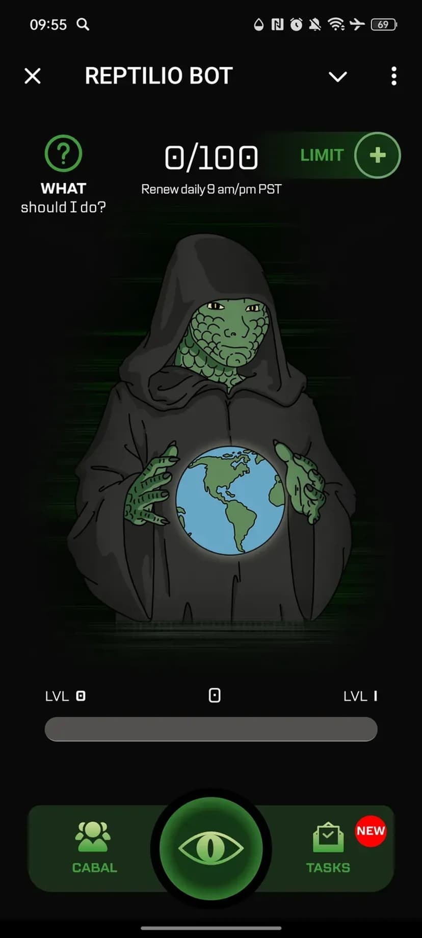 REPTILIO BOT — геймифицированная система прогресса внутри Telegram: проходите игровые этапы, повышайте уровень до заданного X и открывайте эксклюзивные возможности — доступ в закрытое сообщество, уникальные дропы и дополнительные опции.