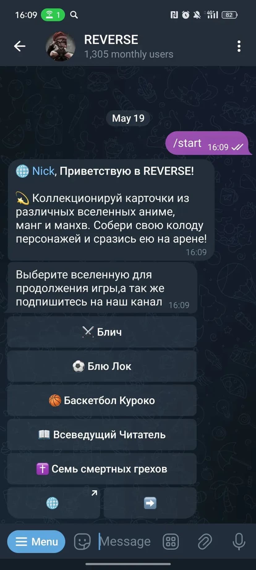 REVERSE — карточный бот, в котором собирают виртуальные карты персонажей из известных аниме, манги и манхвы, формируют собственные колоды и проводят PvP‑дуэли в арене. Игровой процесс, обмен картами и отслеживание прогресса происходят прямо через мессенджер.