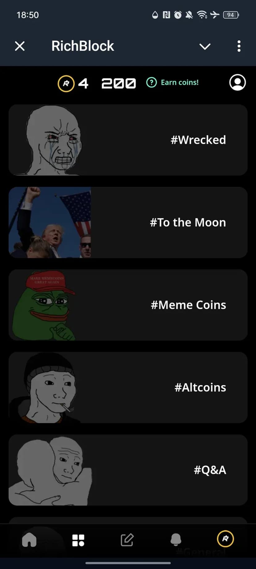 При первом запуске RichBlock открывает анонимный чат, сосредоточенный на обсуждении криптовалют и событий Web3. Общение выстроено в тематические ветки: пользователи могут оставлять сообщения без раскрытия личности. В главном меню есть быстрый доступ к популярным темам, настройкам приватности и уведомлениям о новых обсуждениях.