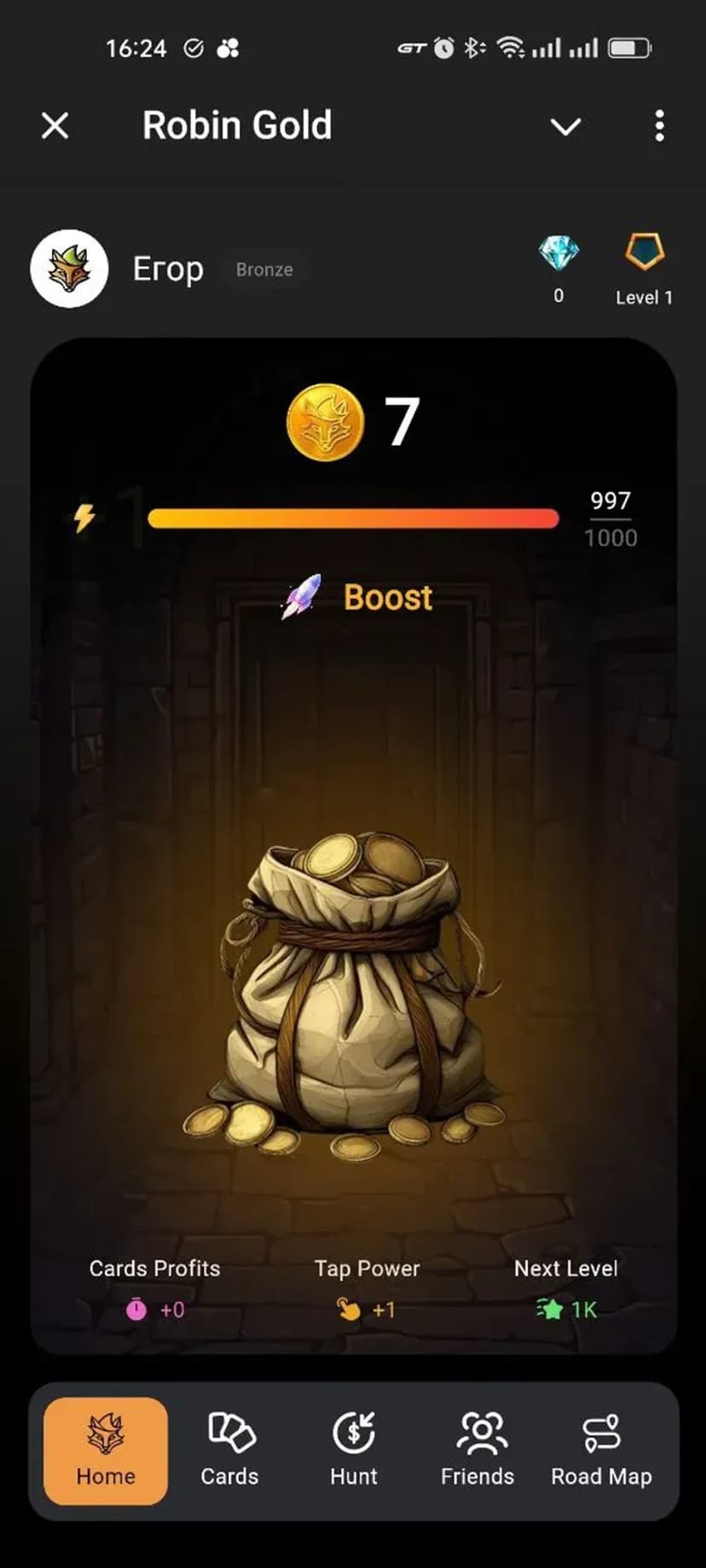 Robin Gold — кликер внутри Telegram: нажимайте, чтобы наполнять сумку монет, которая по мере роста автоматически апгрейдится до более вместительных сундуков и увеличивает возможный доход.