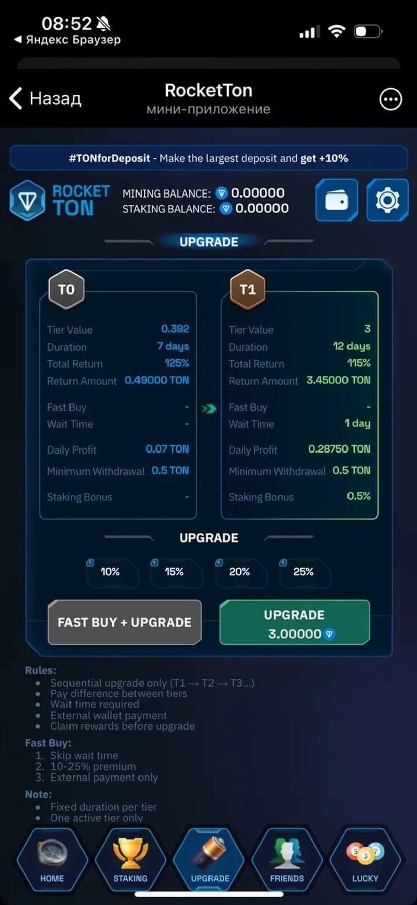Интерфейс прост и нацелен на удобное переключение между режимами, отслеживание доходности и баланса. Рекомендуется комбинировать майнинг и стейкинг для диверсификации дохода и регулярно проверять доступные бонусы и акции.