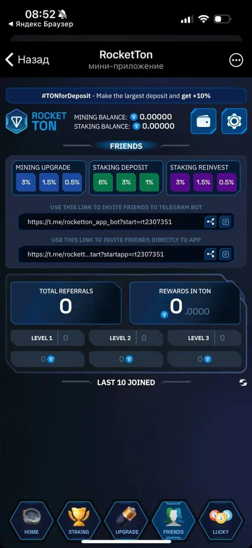 RocketTON предлагает облачный майнинг и стейкинг в сети TON, давая возможность зарабатывать без собственного оборудования или первоначальных вложений за счёт бесплатного стартового уровня.