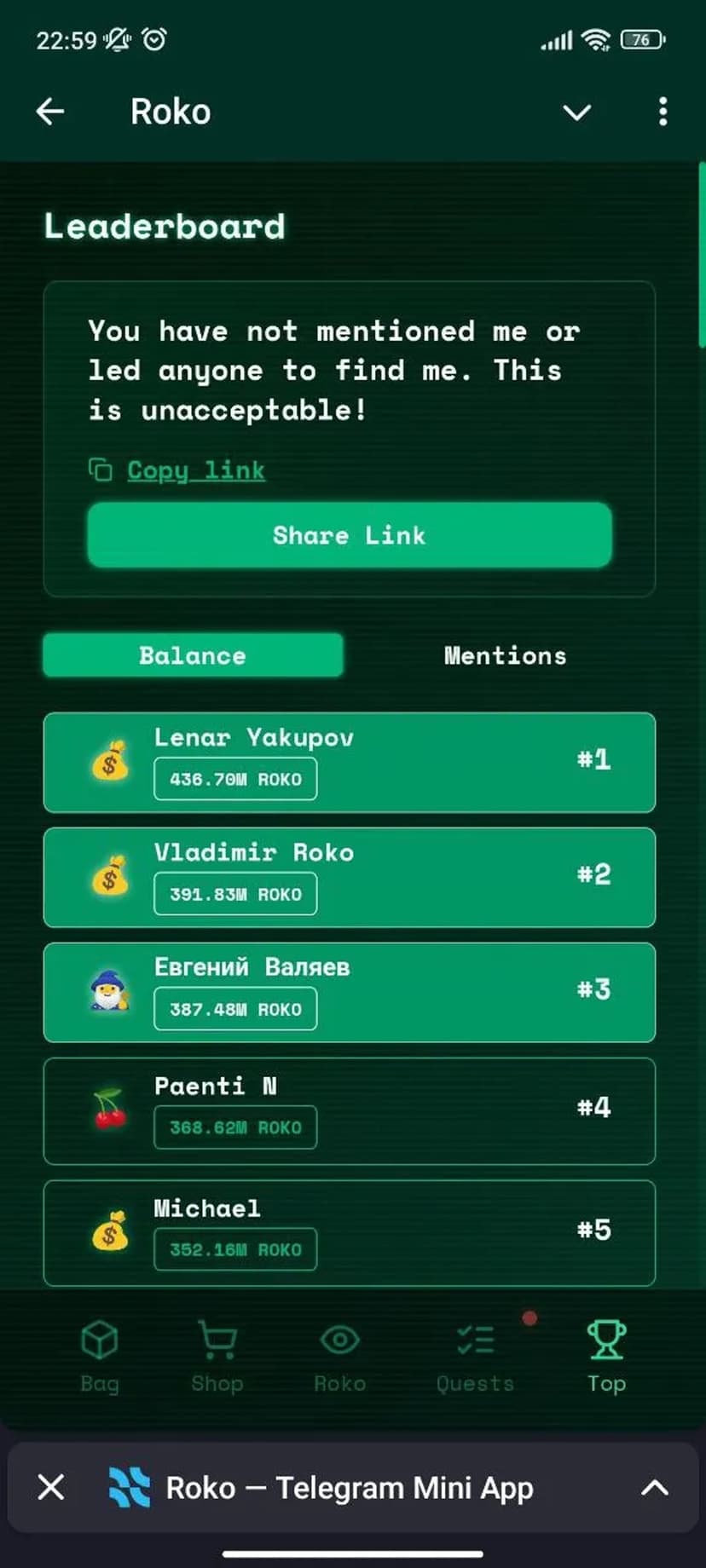 - Упоминания и реакции: система поощряет осмысленные сообщения о проекте в публичных чатах. Использование фирменного emoji-пака повышает награды; первое упоминание в чате может принести до 250 000 ROKO.